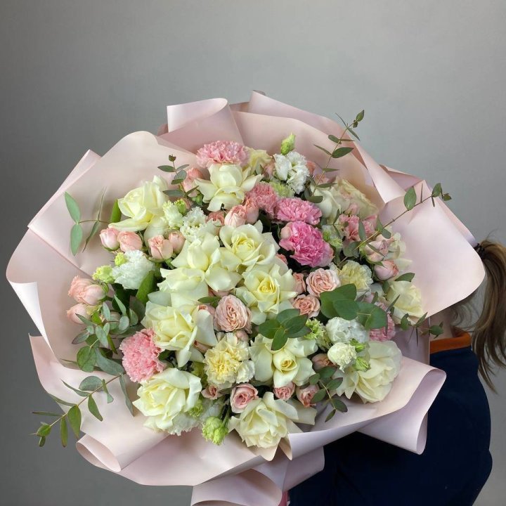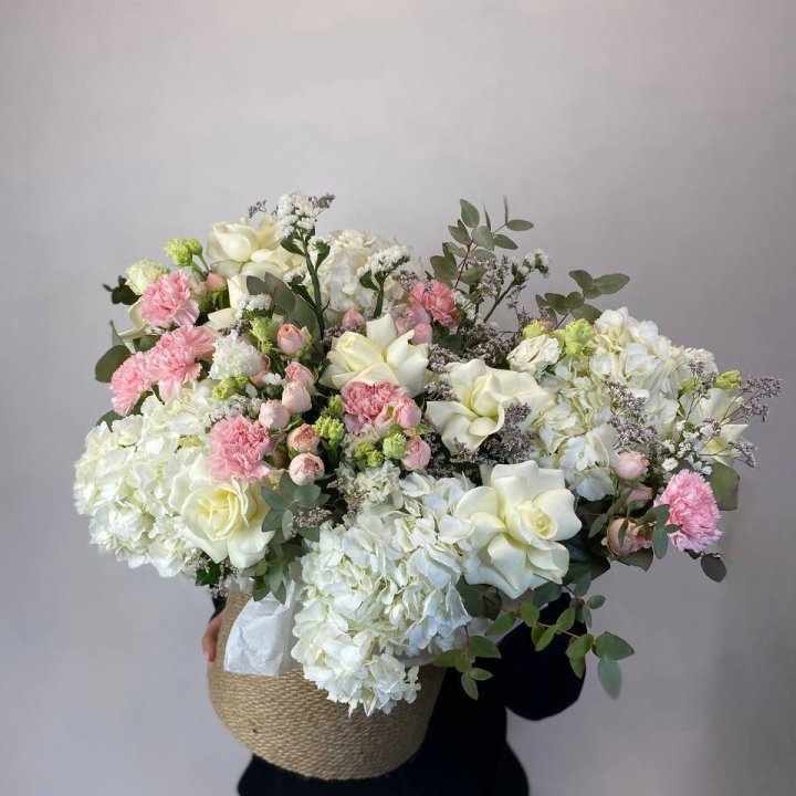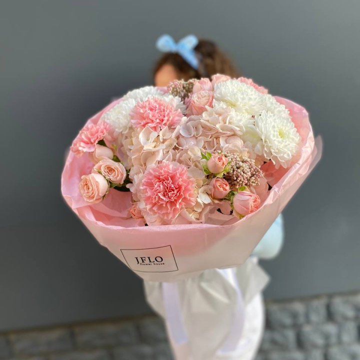 В сезон (весна и лето) ассортимент шире: пионы, ранункулюсы, тюльпаны местные и голландские, ромашки, гортензия. Круглый год — розы от 50 см стебель, кустовые хризантемы, альстромерия, гипсофила, эустома, гвоздики, эвкалипт для миксов.