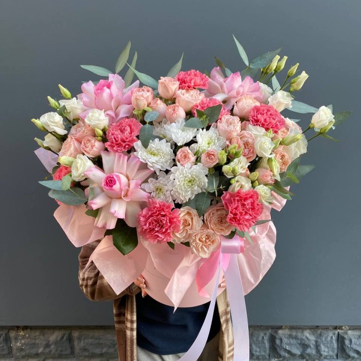 Форматы — моно-букет, авторский микс, шляпная коробка, корзина с флористической губкой, композиция в вазе. Под повод подбирается состав и габариты: камерный букет для свидания, плотная композиция на юбилей, корзина для корпоративного поздравления.