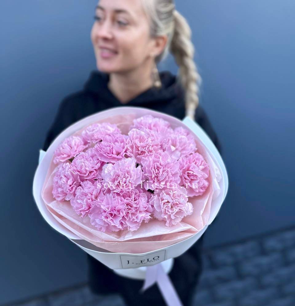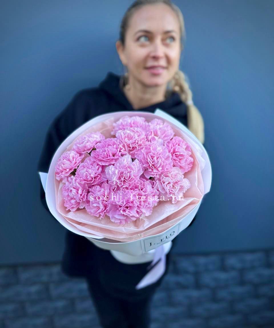 Одиннадцать кустовых роз с густыми многолепестковыми бутонами в нежно-розовой гамме. Каждая ветка раскрывается несколькими головками, создавая пышную объемную форму. Для тех, кто любит выразительные букеты с характером.