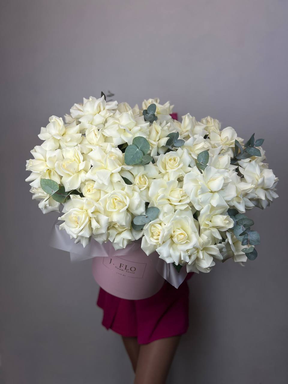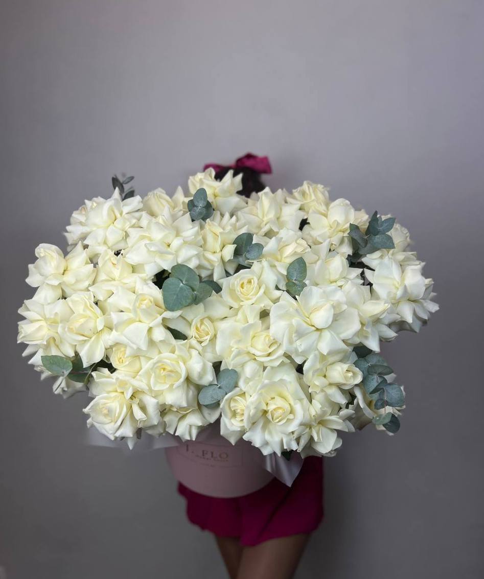 Пятьсот один бутон выстроены плотными рядами в глубокой корзине. Белоснежная композиция создаёт эффект цветочного облака, способного заполнить собой всё пространство вокруг.