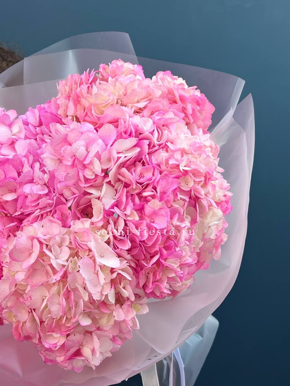 Девять ярких соцветий гортензии насыщенного розового цвета. Каждая шапка раскрыта полностью, создавая плотную текстуру и глубокий оттенок, который не оставит равнодушным.