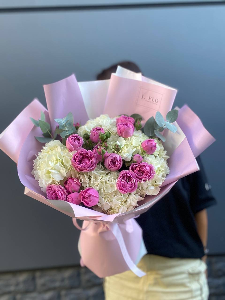 гортензия нежно-розовых оттенков, эустома, львиный зев или маттиола, розовые розы, эвкалипт, вспомогательная зелень, лента, светлая корзин.
