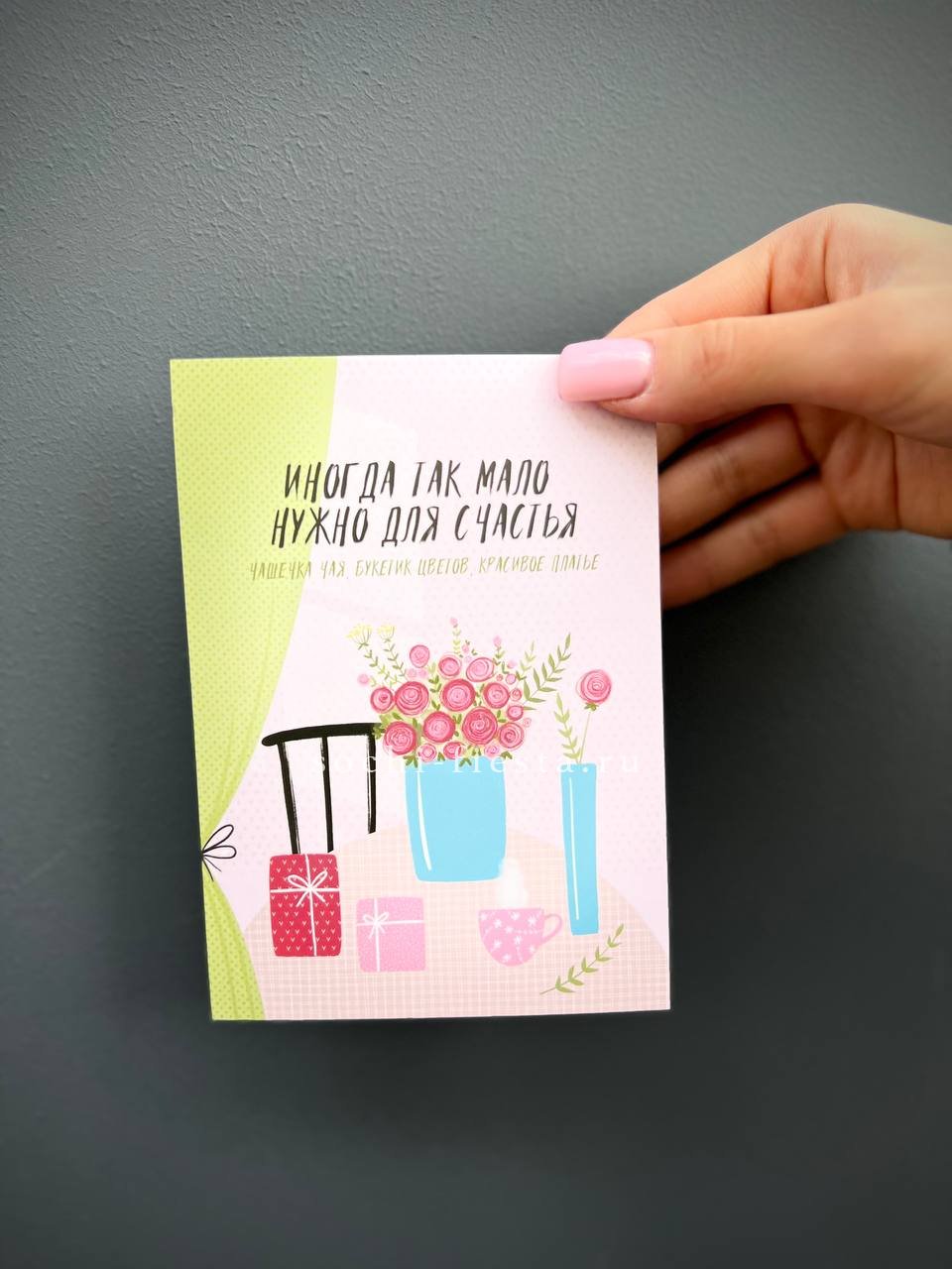 Конечно! К каждому заказу мы бесплатно прикладываем подарочную открытку с вашим текстом. Просто напишите пожелание при оформлении заказа.