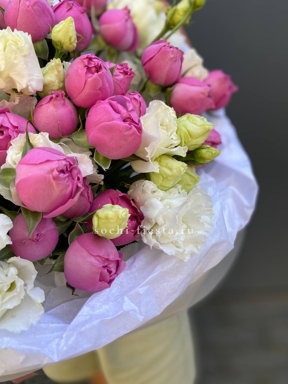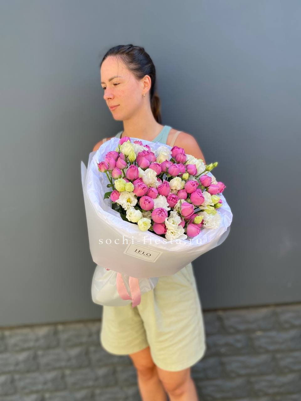 Этот букет — настоящий манифест женственности и ярких эмоций! Он выглядит очень эффектно за счет сочетания разных оттенков розового и игры фактур.