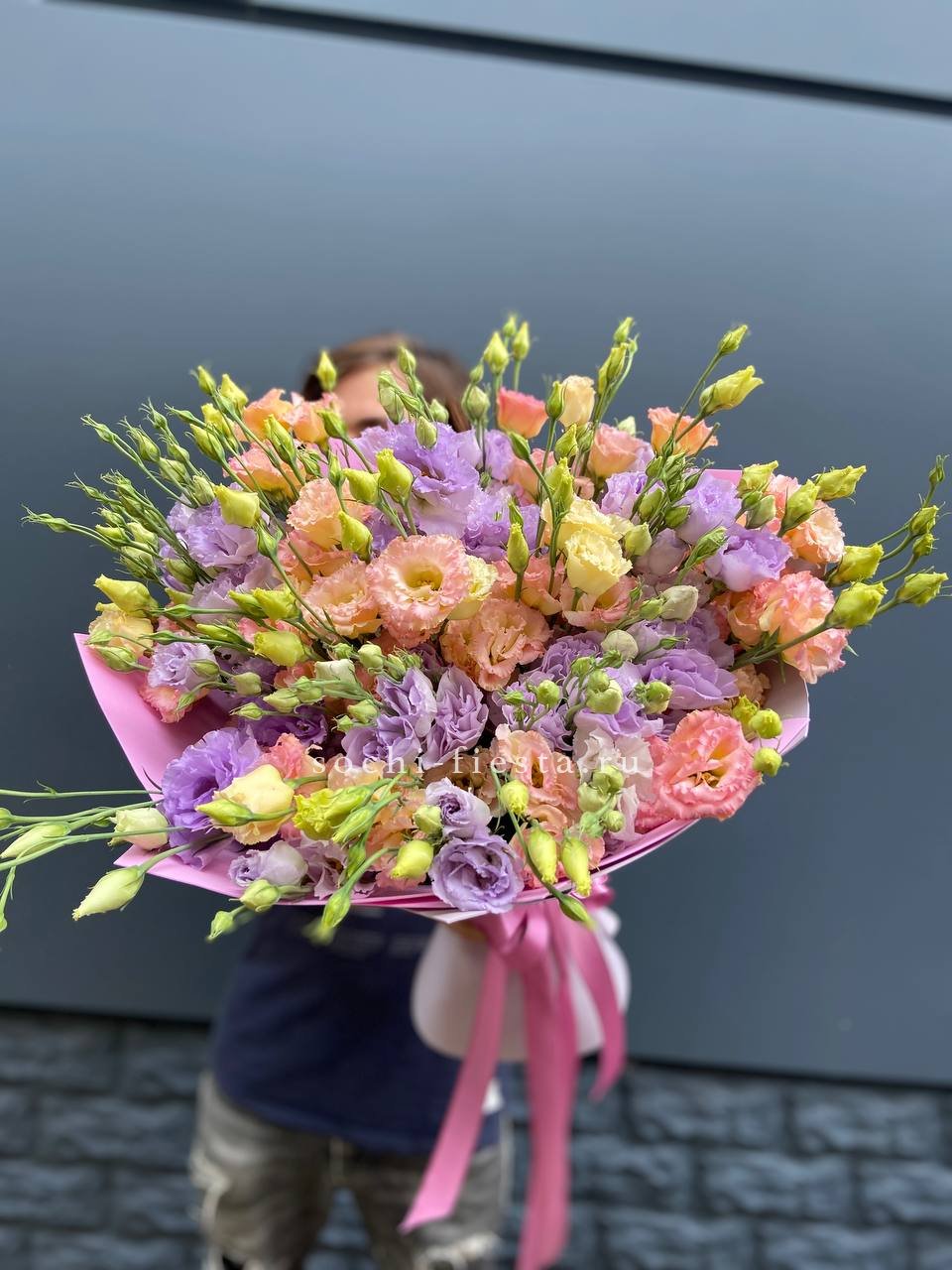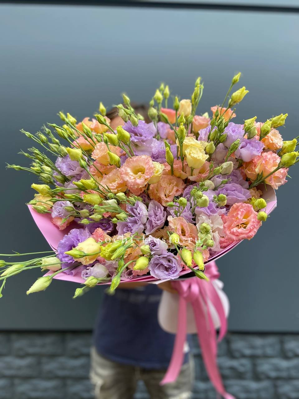 Пятнадцать воздушных эустом собраны в пудровое облако с мягкими переходами оттенков. Многослойные бутоны создают объёмную текстуру и удивительную глубину композиции.