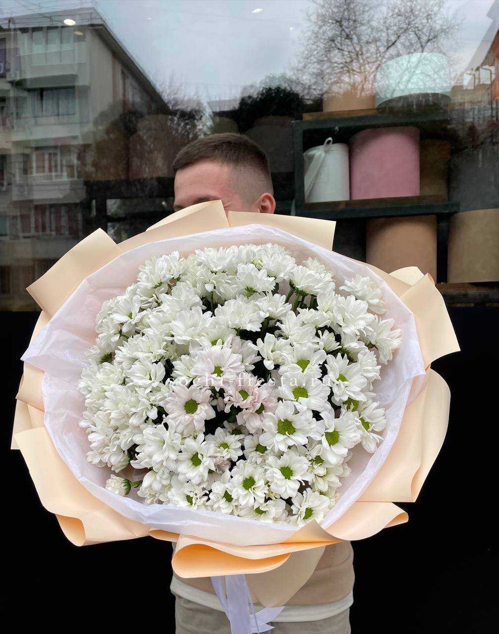 минимальный состав: 11 одноголовых хризантем, лента, упаковка на выбор.