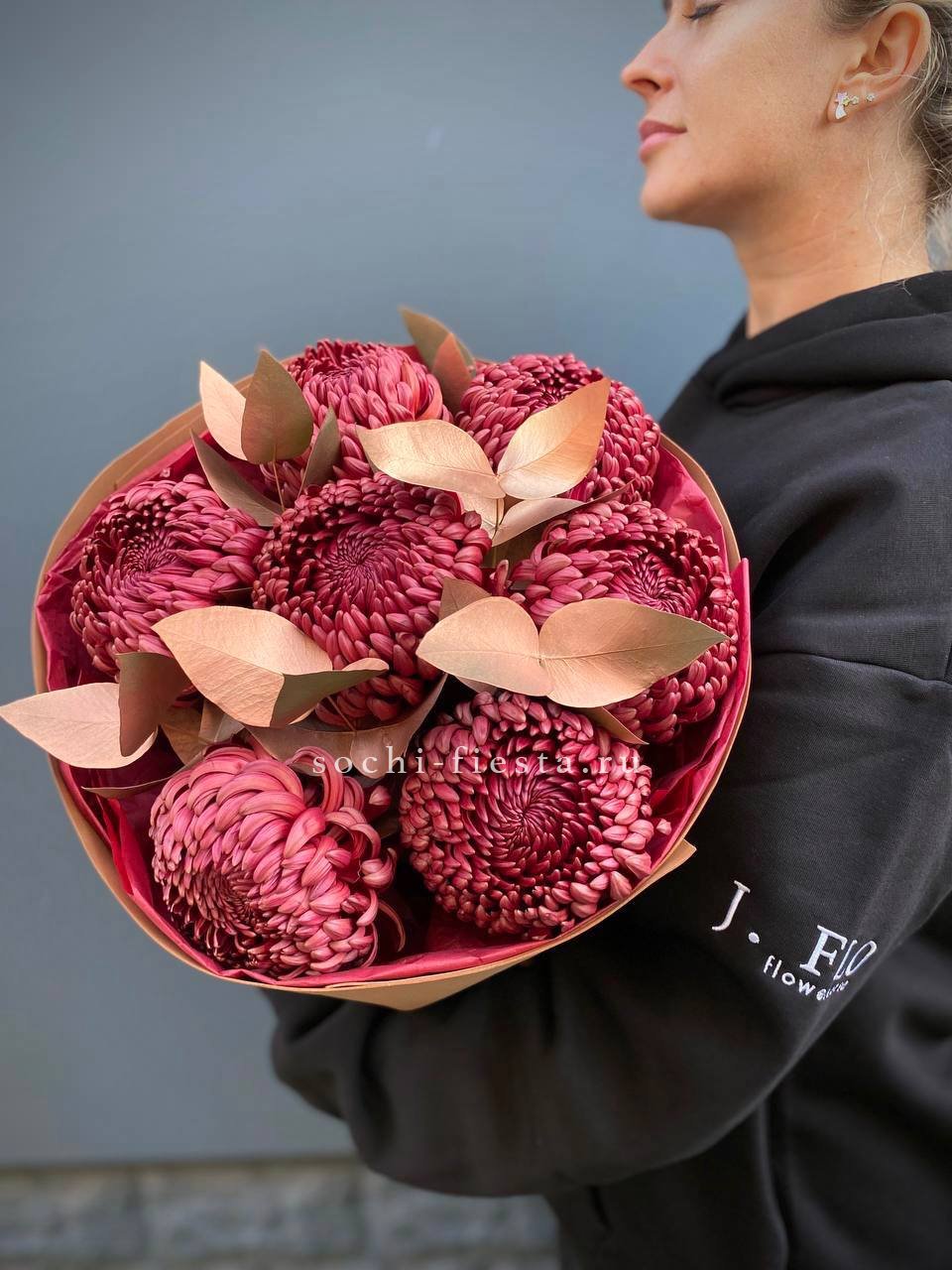 хризантемы - 7 шт, эвкалипт,  лента, дизайнерская упаковка.