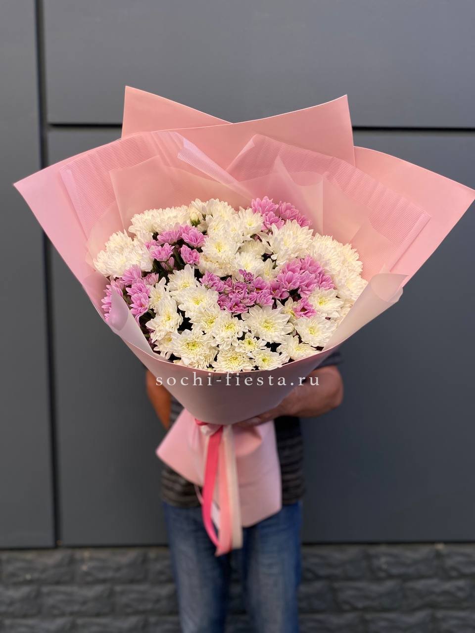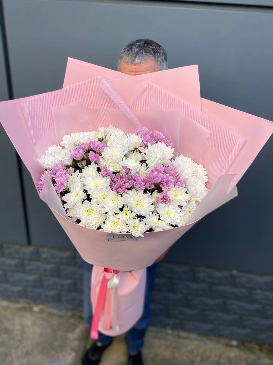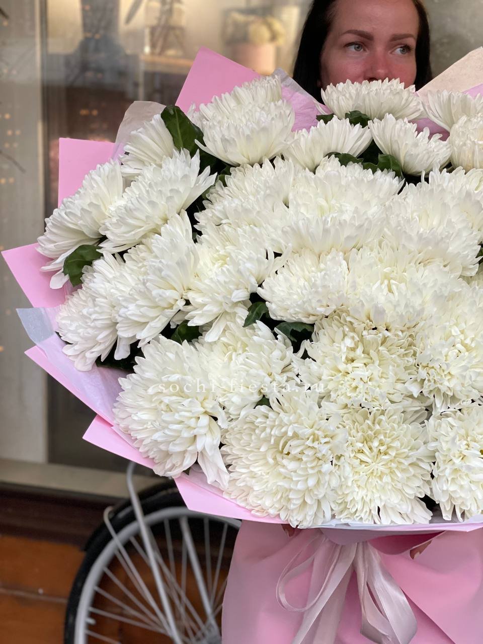 Пятнадцать веток кустовой хризантемы в натуральном крафте. Множество мелких соцветий формируют пышную шапку с естественной россыпью бутонов, подчёркнутую простотой оформления.