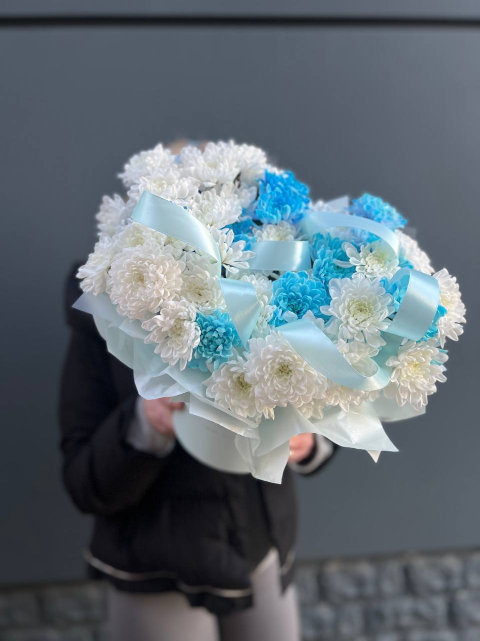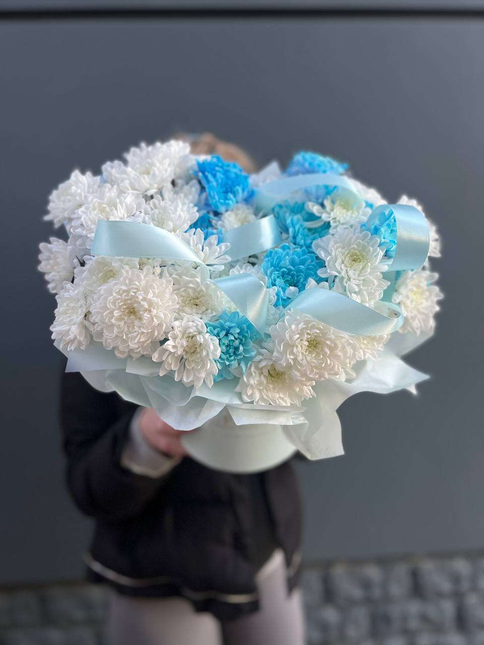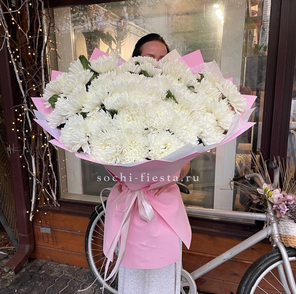 Пятнадцать веток кустовой хризантемы в натуральном крафте. Множество мелких соцветий формируют пышную шапку с естественной россыпью бутонов, подчёркнутую простотой оформления.