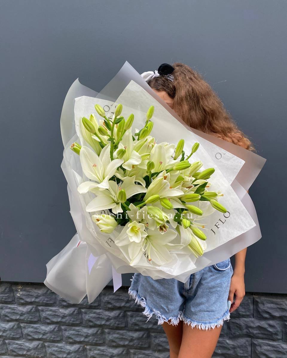 Семь белых лилий собраны в классический букет с лаконичной упаковкой. Крупные бутоны раскрываются постепенно, наполняя пространство своим присутствием.
