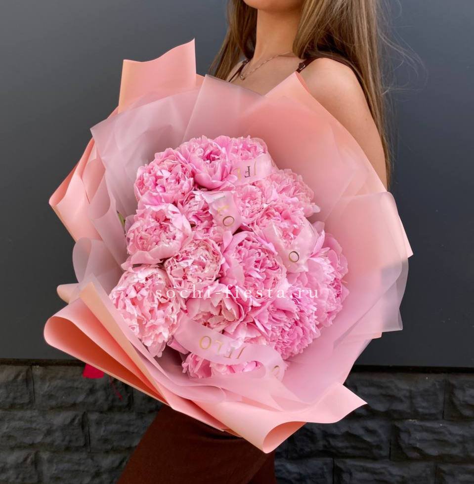 15 розовых местных пионов, лента, комбинированное оформление.