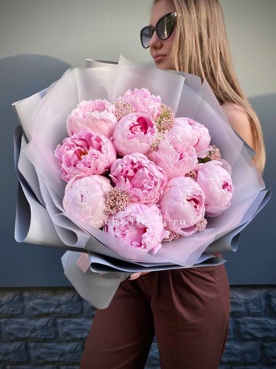 розовые пионы, озатамус, лента, дизайнерская упаковка.