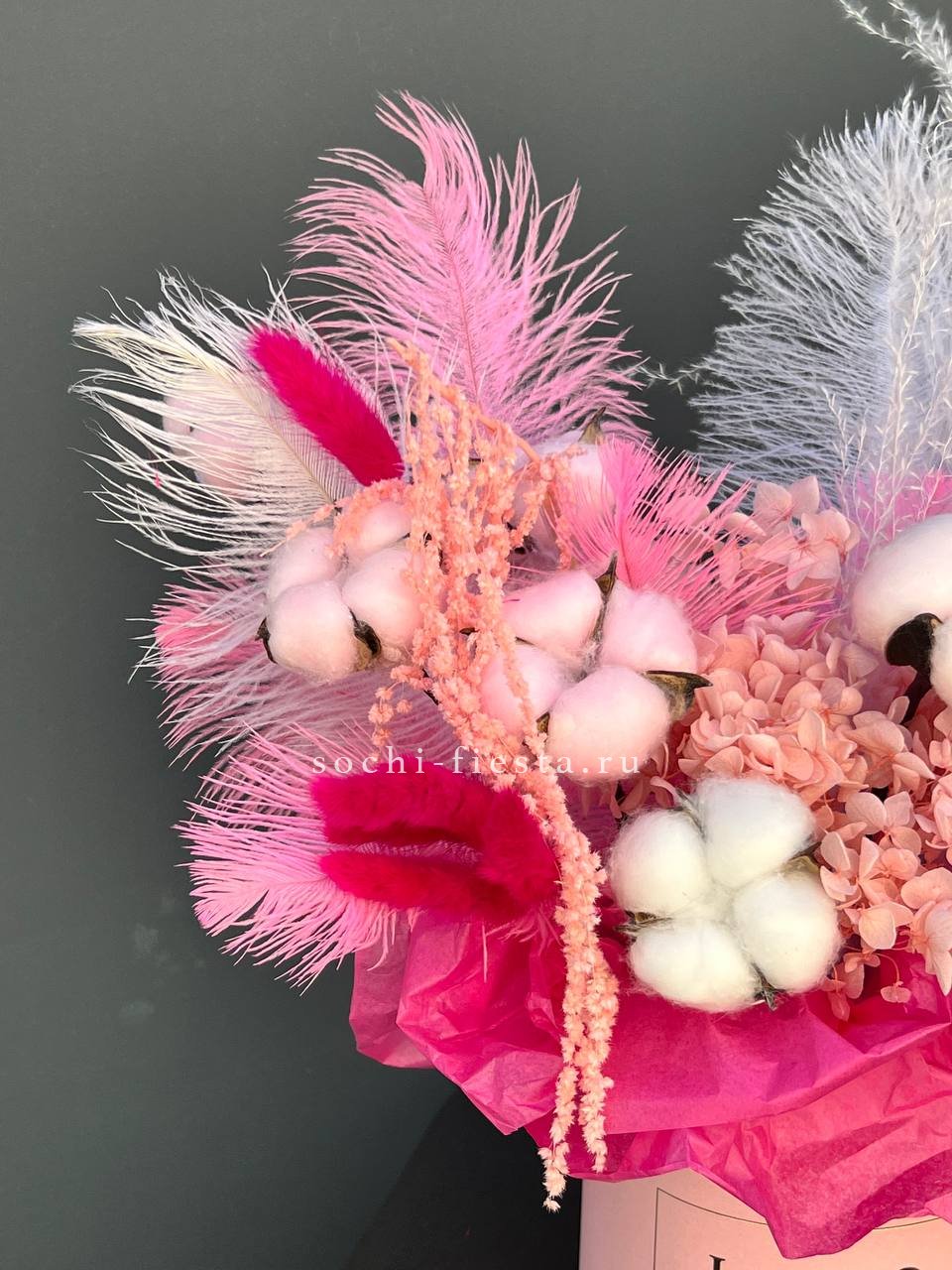 Композиция в цилиндре с лагурусом, хлопком и амарантом создает впечатление природной гармонии. Перья вносят легкость. Удобна в размещении и долго сохраняет первоначальный вид.