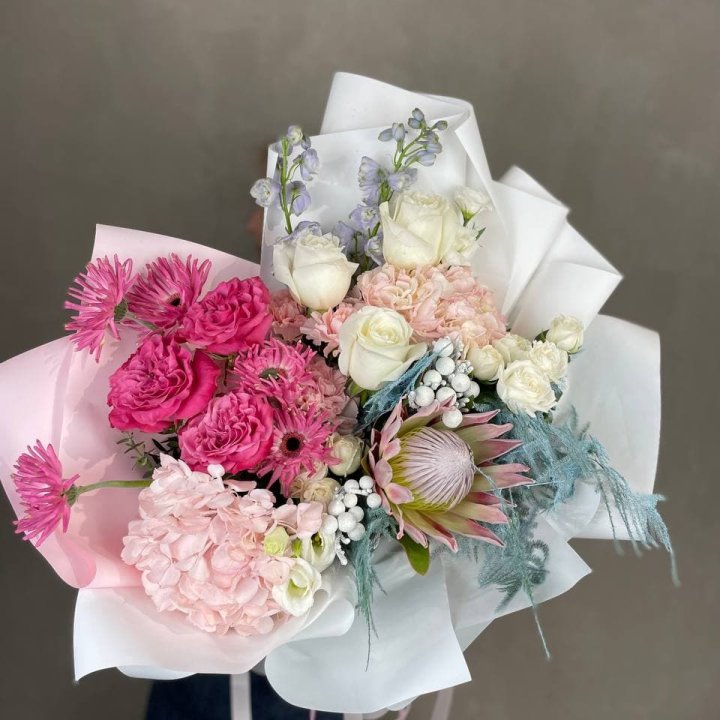Доставка авторских букетов в Прокопьевске — в специальной упаковке, сохраняющей форму. Самовывоз из студии — основная опция для большинства заказов: клиент видит работу до получения. Флорист доставляет крупные корпоративные и свадебные работы самостоятельно для контроля качества.