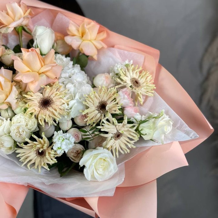 - Редкий состав — David Austin, ранункулюс, анемоны, сезонные пионы.