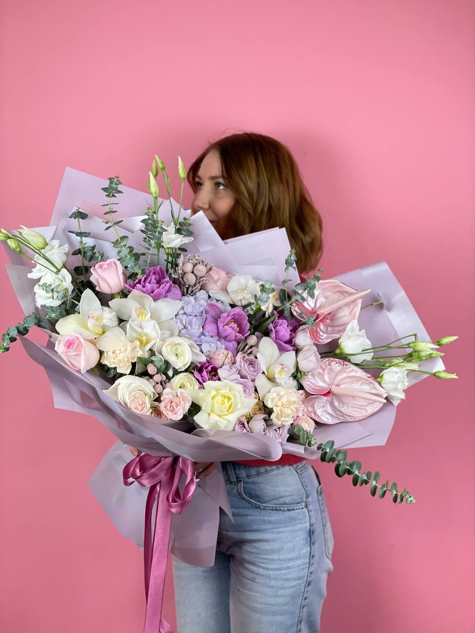 Антуриум встречается с розами и эустомой в свободной композиции, где каждый цветок сохраняет свою выразительность. Бруния и диантусы добавляют графичные точки, а эвкалипт создает воздушный объем.