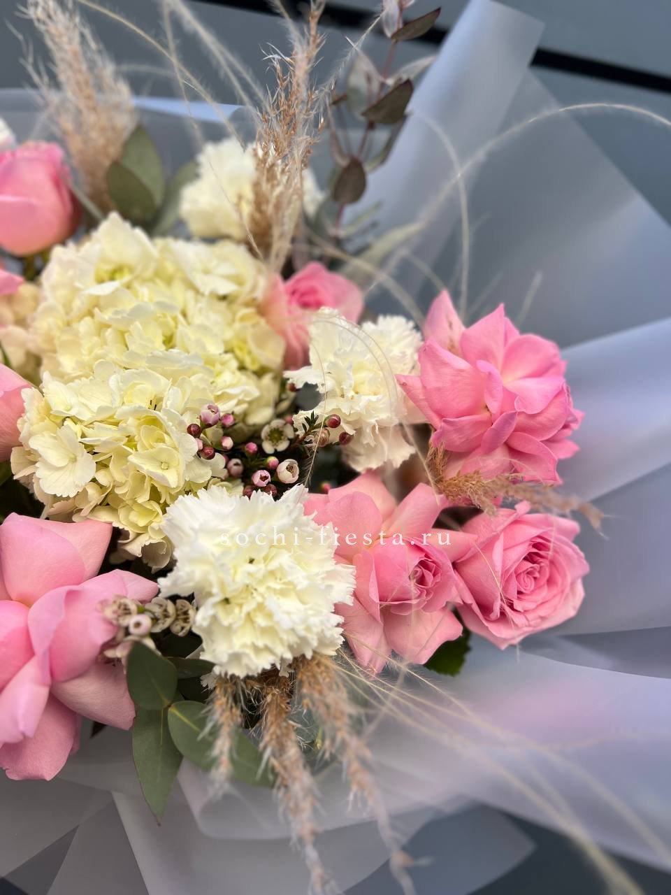 розы, диантусы, пионовидные кустовые розы, маттиола (или аналог вне сезона), эвкалипт, лента, крафт.