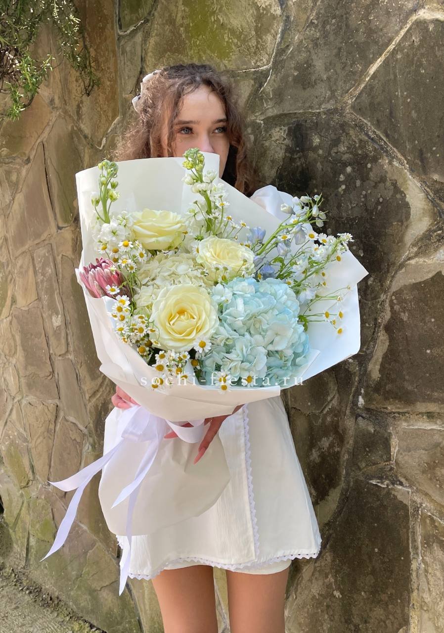 гортензия, розы одноголовые, дельфиниум (аналог вне сезона), ромашка, протея, маттиола (аналог вне сезона), лента, дизайнерская упаковка.