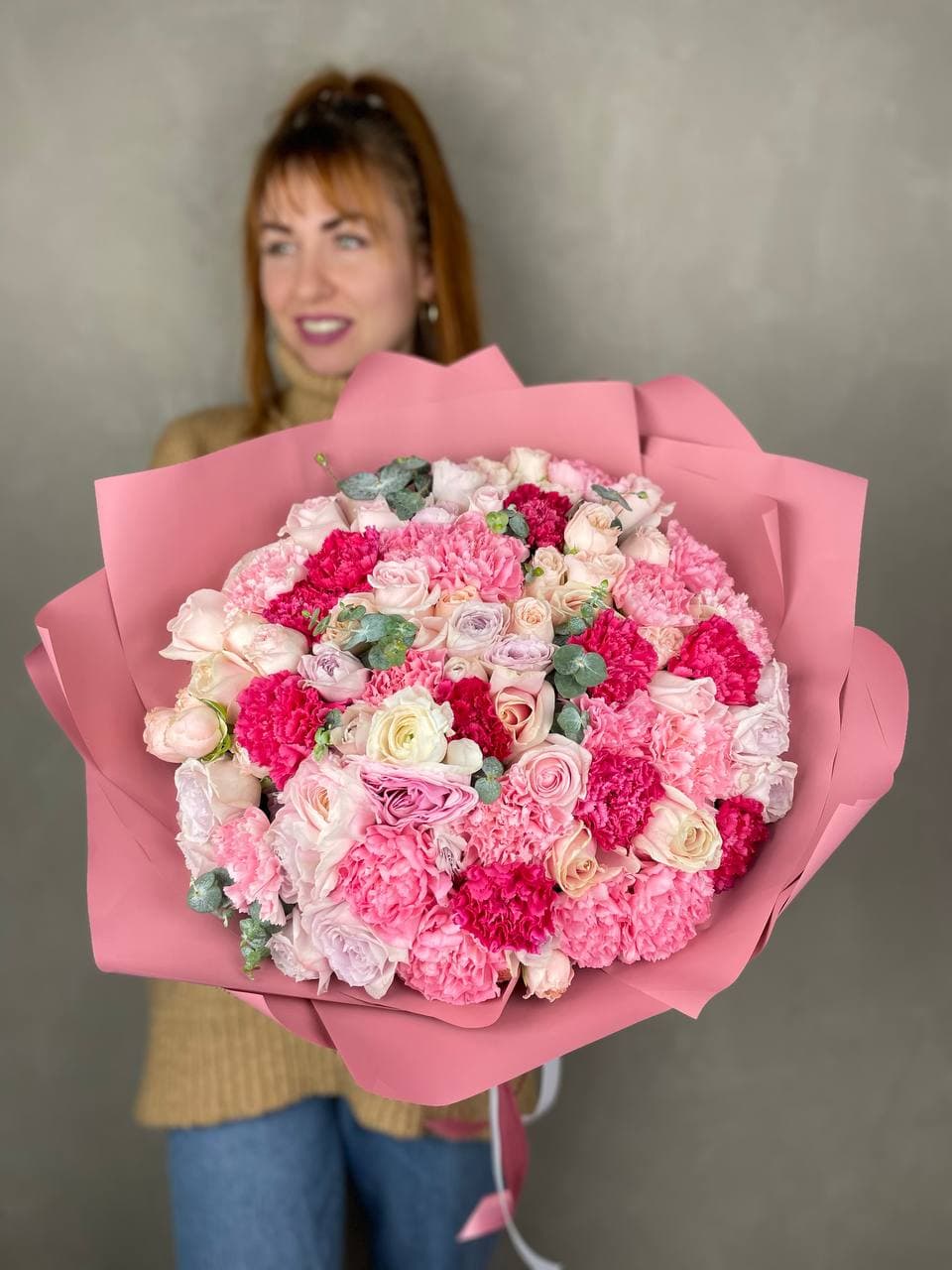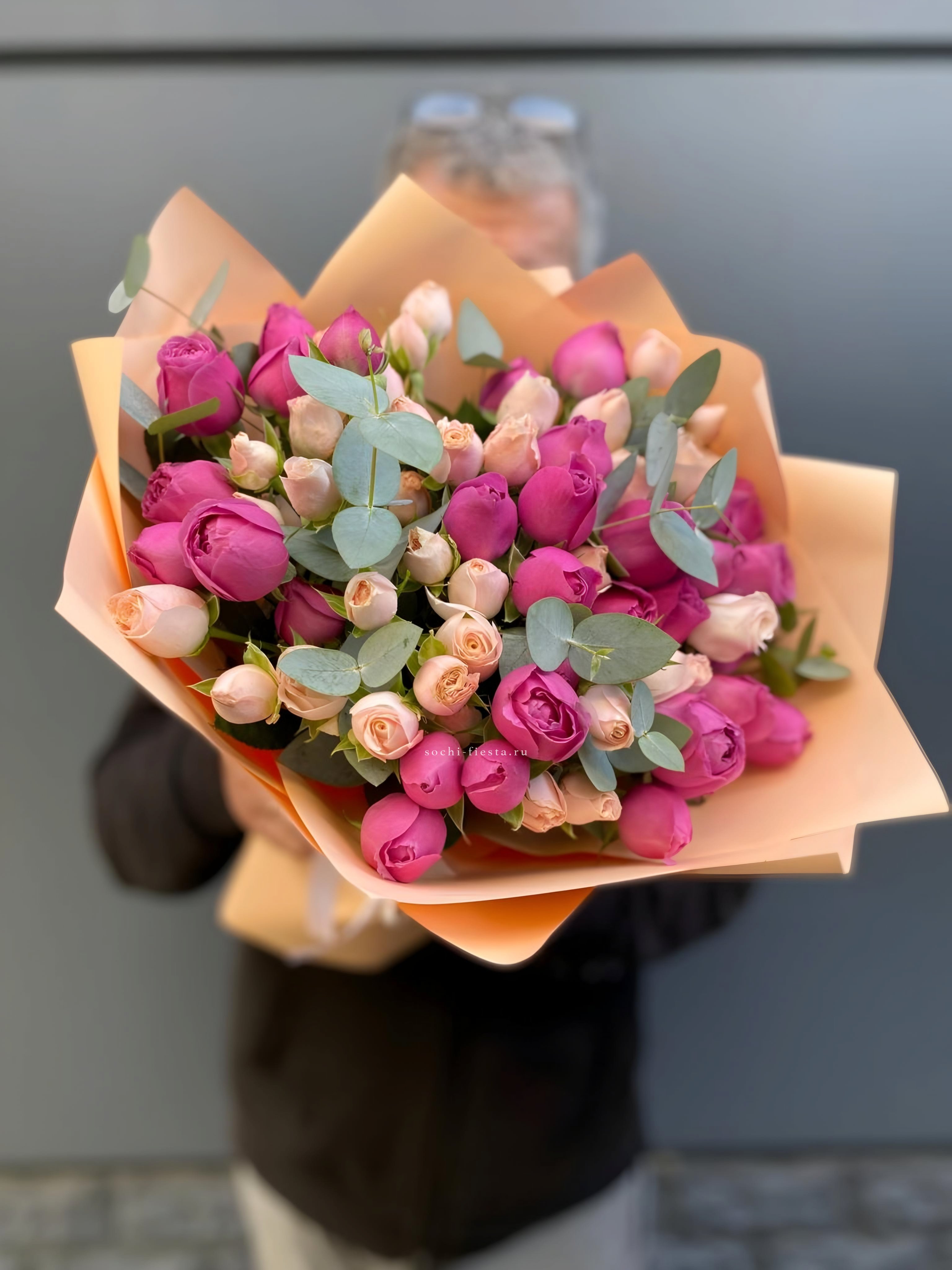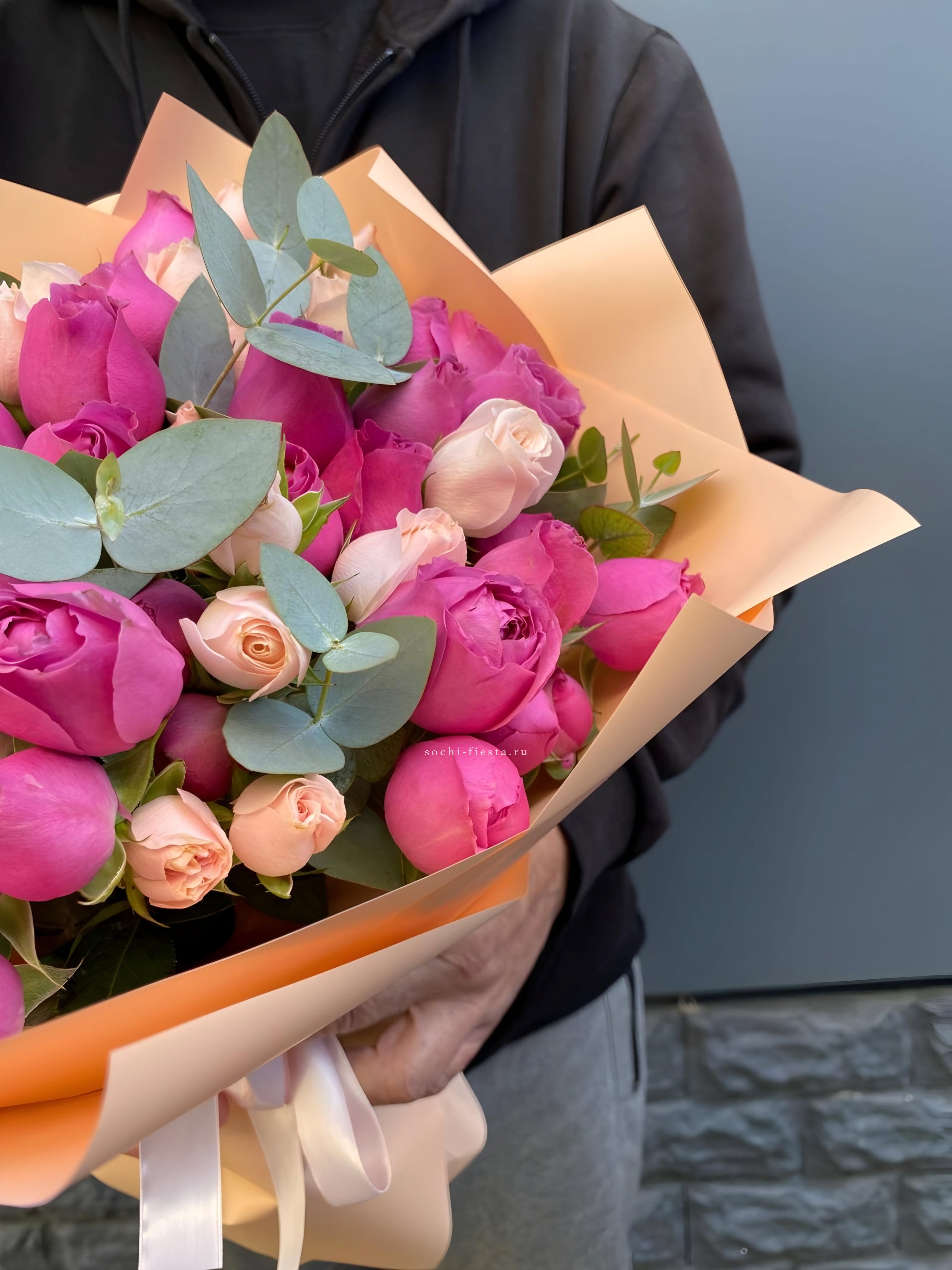 розы, пионовидные кустовые розы, диантусы, эвкалипт, лента, дизайнерская упаковка.