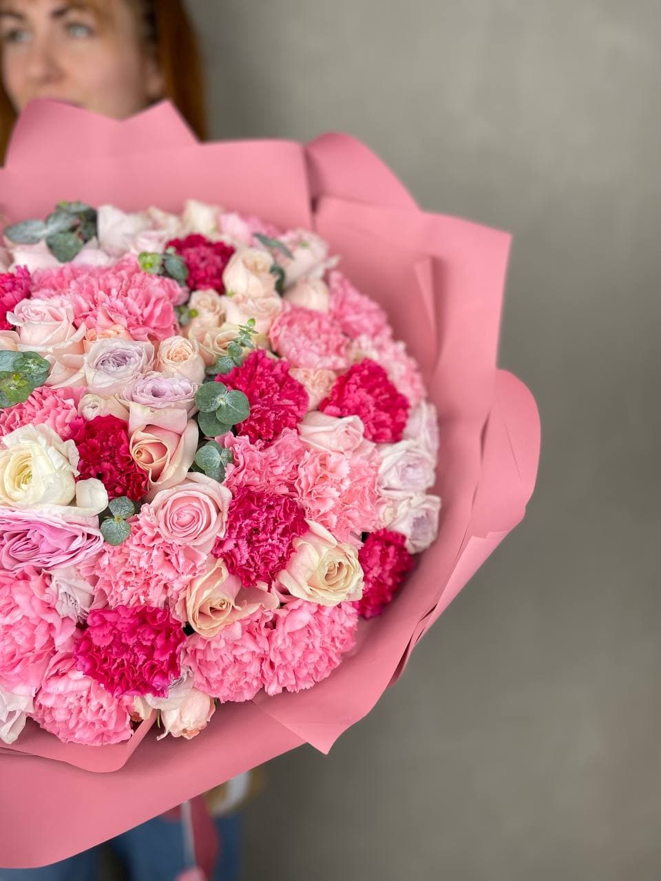 Пионовидные бутоны с волнистыми лепестками соседствуют с графичными диантусами и свежими ветками эвкалипта. Авторская упаковка завершает образ, добавляя композиции современное звучание.