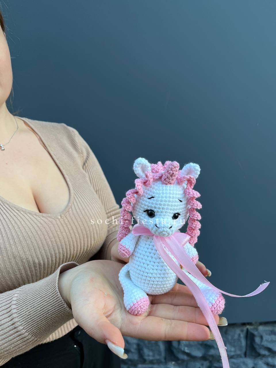 на фотографии единорог, ручное плетение. Доставка данной товарной единицы бесплатна при условии её заказа с цветами.
