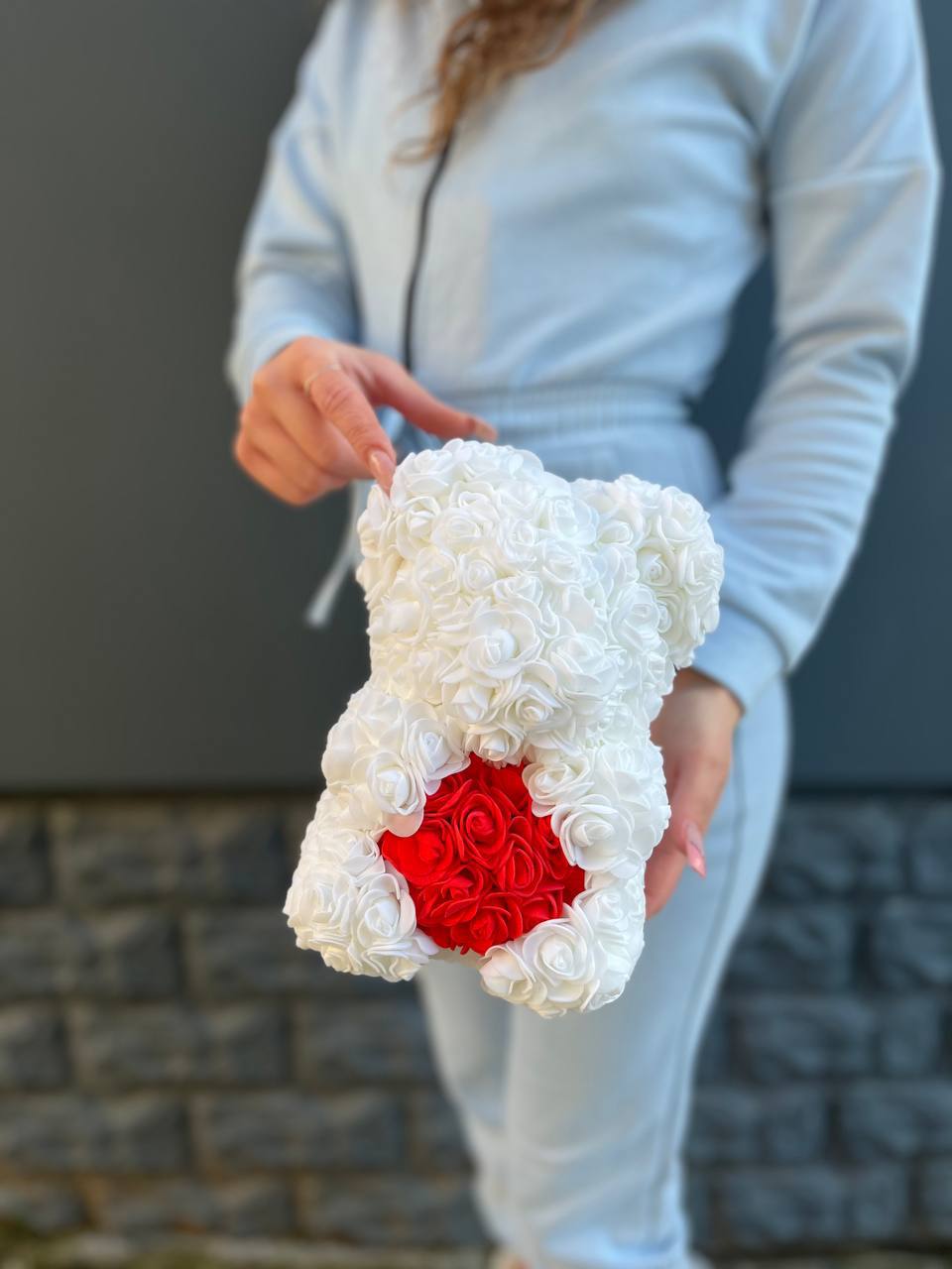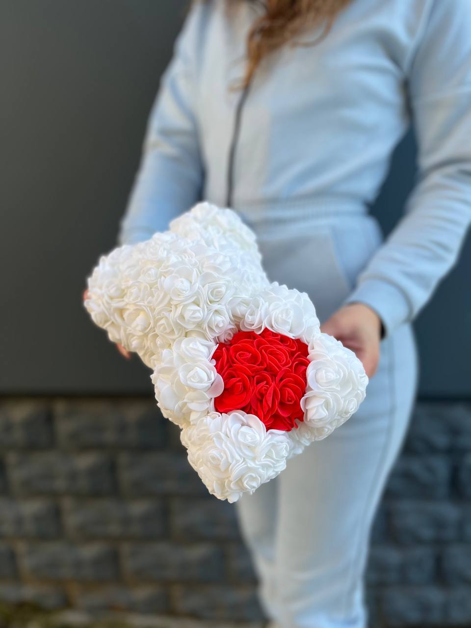 Белоснежная фигурка медведя держит яркое алое сердце. Материал фоамиран придаёт бутонам объём и стойкость формы. Выразительный акцент среди других подарков.