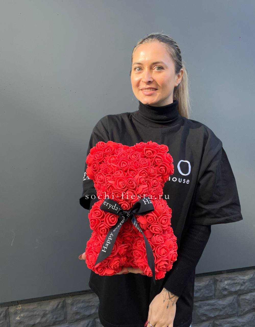 Фигурка медведя собрана из бутонов насыщенного алого оттенка. Каждый лепесток из фоамирана сохраняет форму и цвет без изменений. Компактная композиция для тех, кто ценит долговечность.