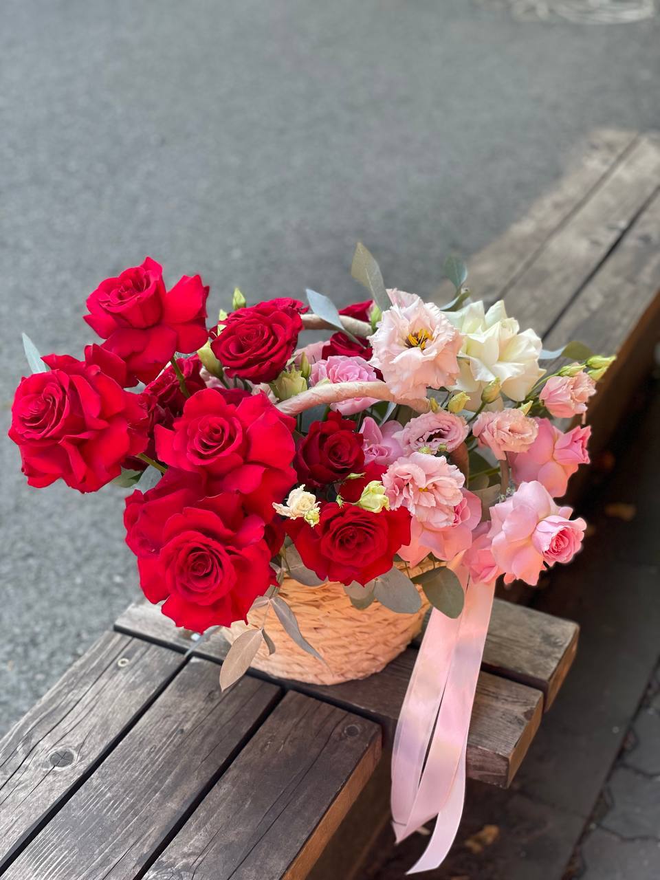 розовые розы, красная роза, эустома, эвкалипт, корзина малая.
