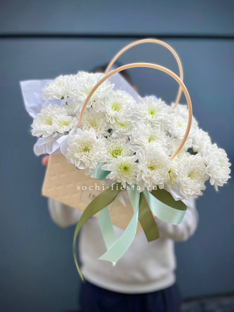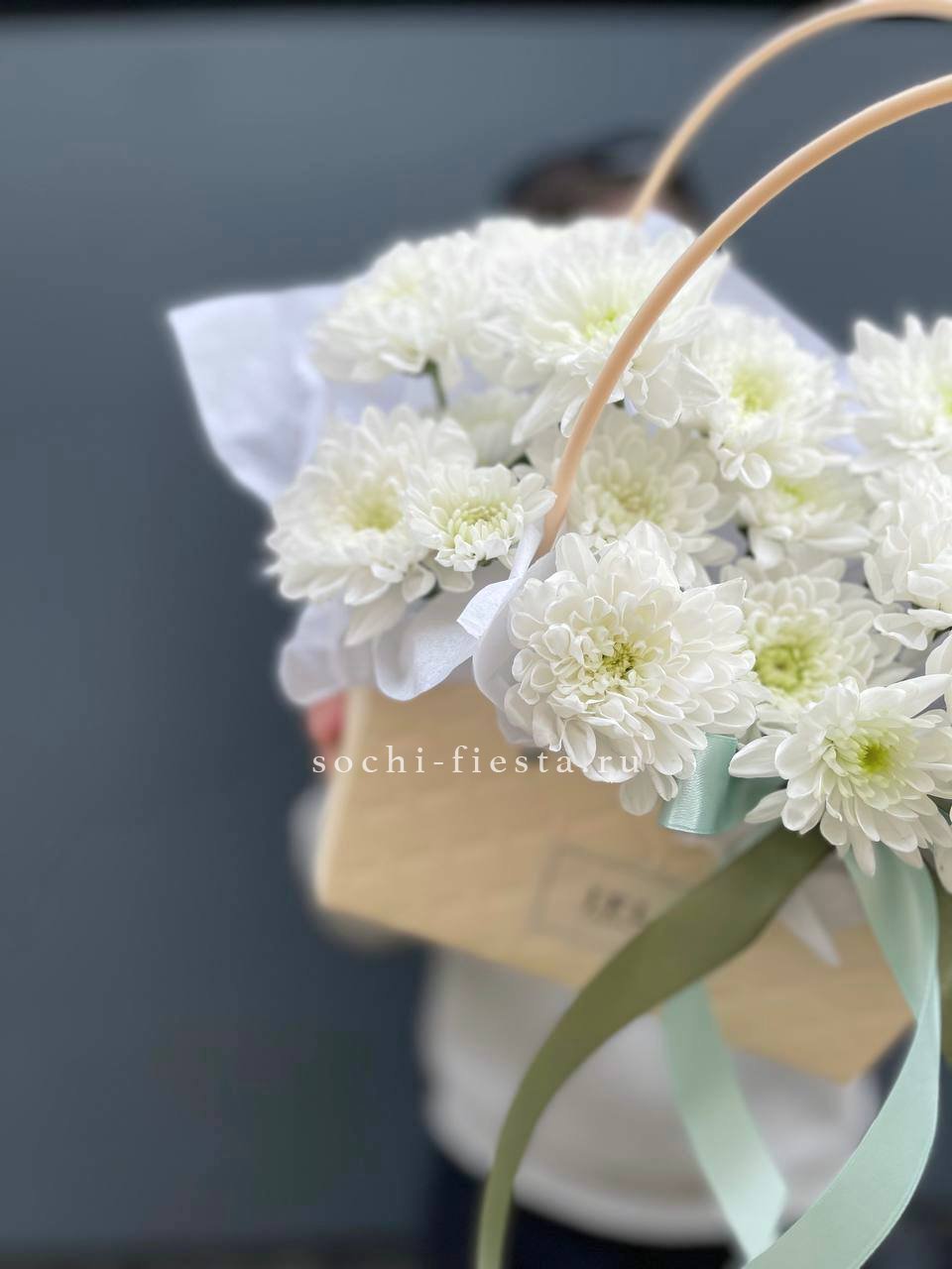 Пятнадцать вывернутых бутонов белого цвета раскрываются объемными шапками с волнистыми краями лепестков. Ветви эвкалипта добавляют букету воздушности и создают мягкую зеленую дымку вокруг цветов.