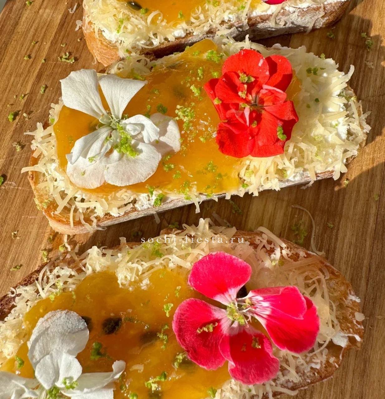 Пятнадцать брускет с разными начинками образуют яркую гастрономическую палитру. Греческие мотивы переплетаются с морскими акцентами, имбирный тунец дополняет свежесть рукколы и креветок.