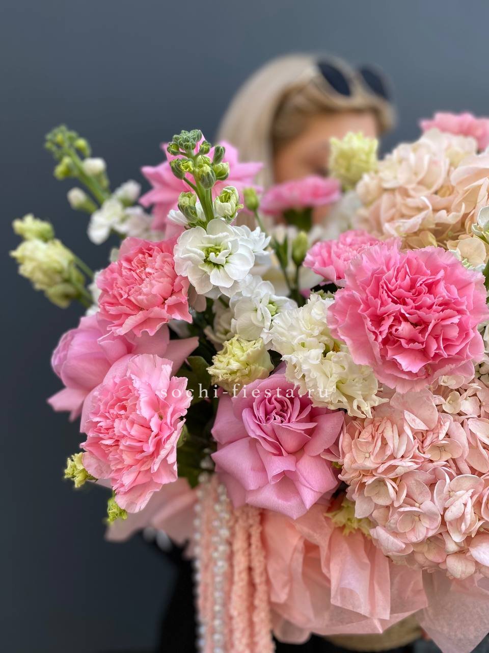 гортензия, диантус, розовые розы, маттиола, эустома, амарант, бусы (возможна замена), джутовое кашпо.