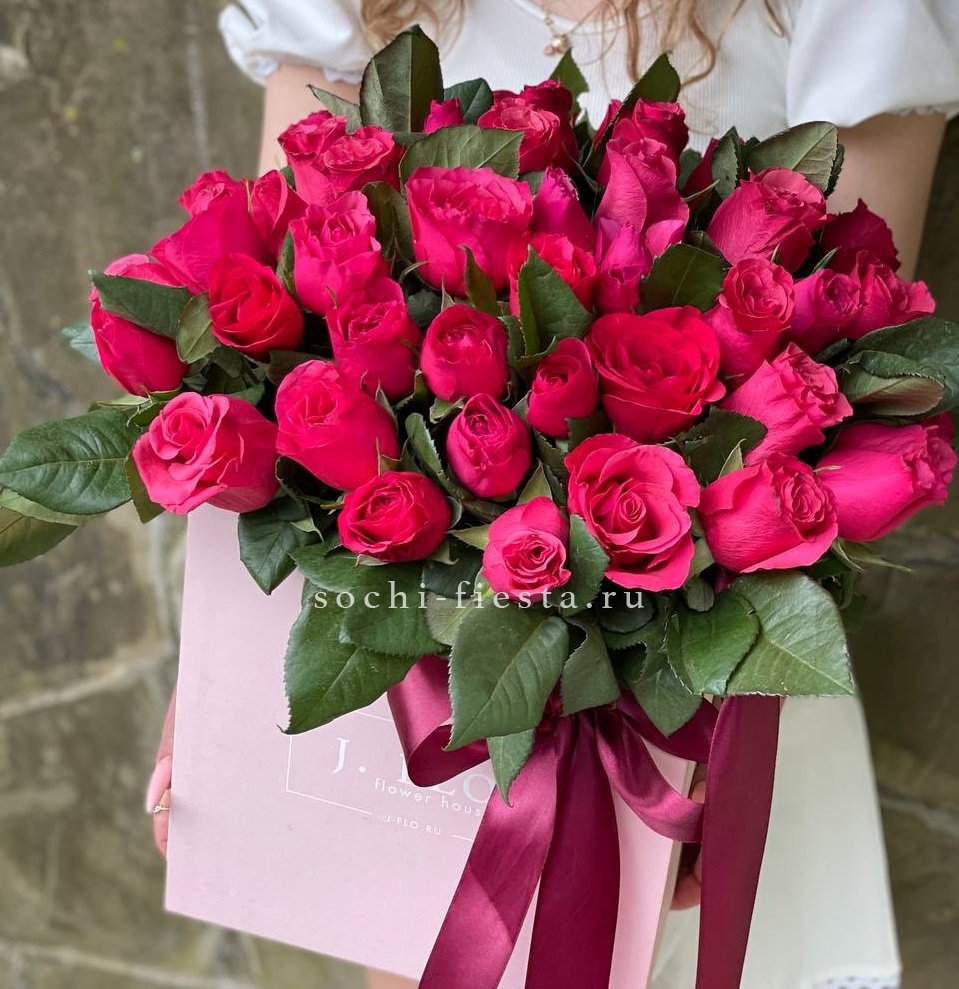 Пятьдесят пять бутонов глубокого красного оттенка собраны в плотную графичную форму. Квадратная коробка задает четкий ритм и усиливает насыщенность цвета.