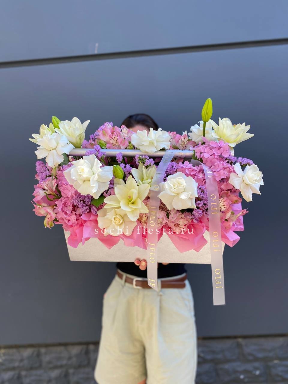 лилии, французские розы, гортензия, альстромерия, статица,деревянный ящик.