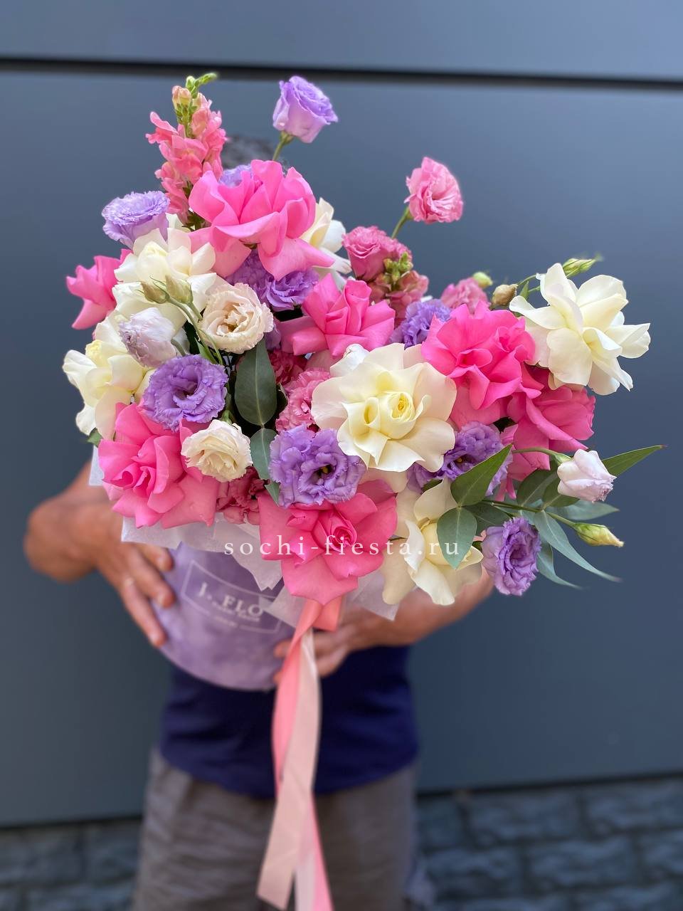 Розовые и белые розы переплетаются с фиолетовыми бутонами эустомы, создавая плавные цветовые переходы. Антиринум вытягивает силуэт вверх, а эвкалипт смягчает края.