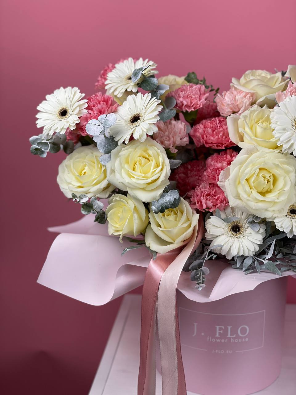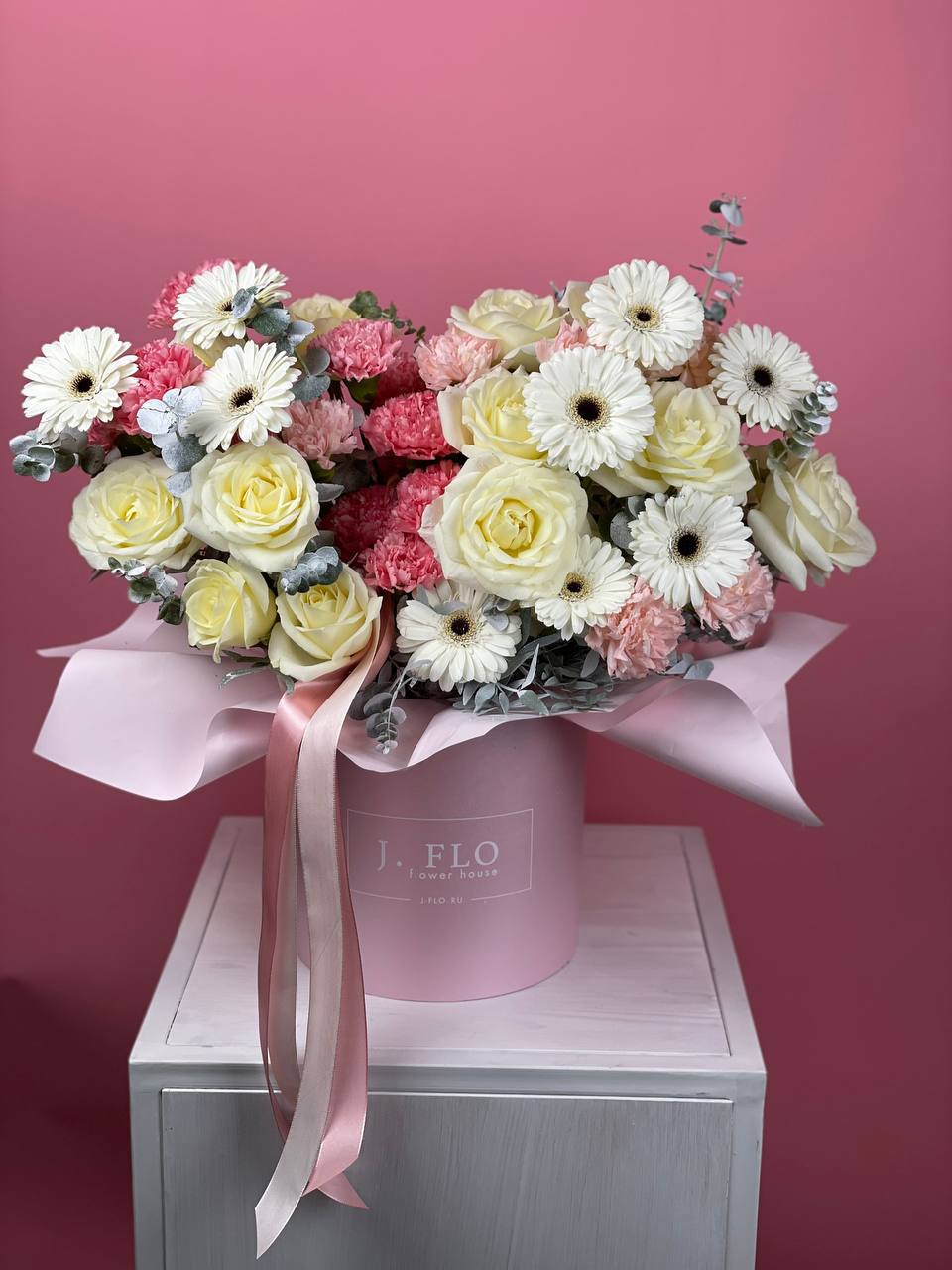 розовые розы,  эустома (если нет фиолетовых замена на статицу), белые розы, эвкалипт, антиринум, цилиндр D20.