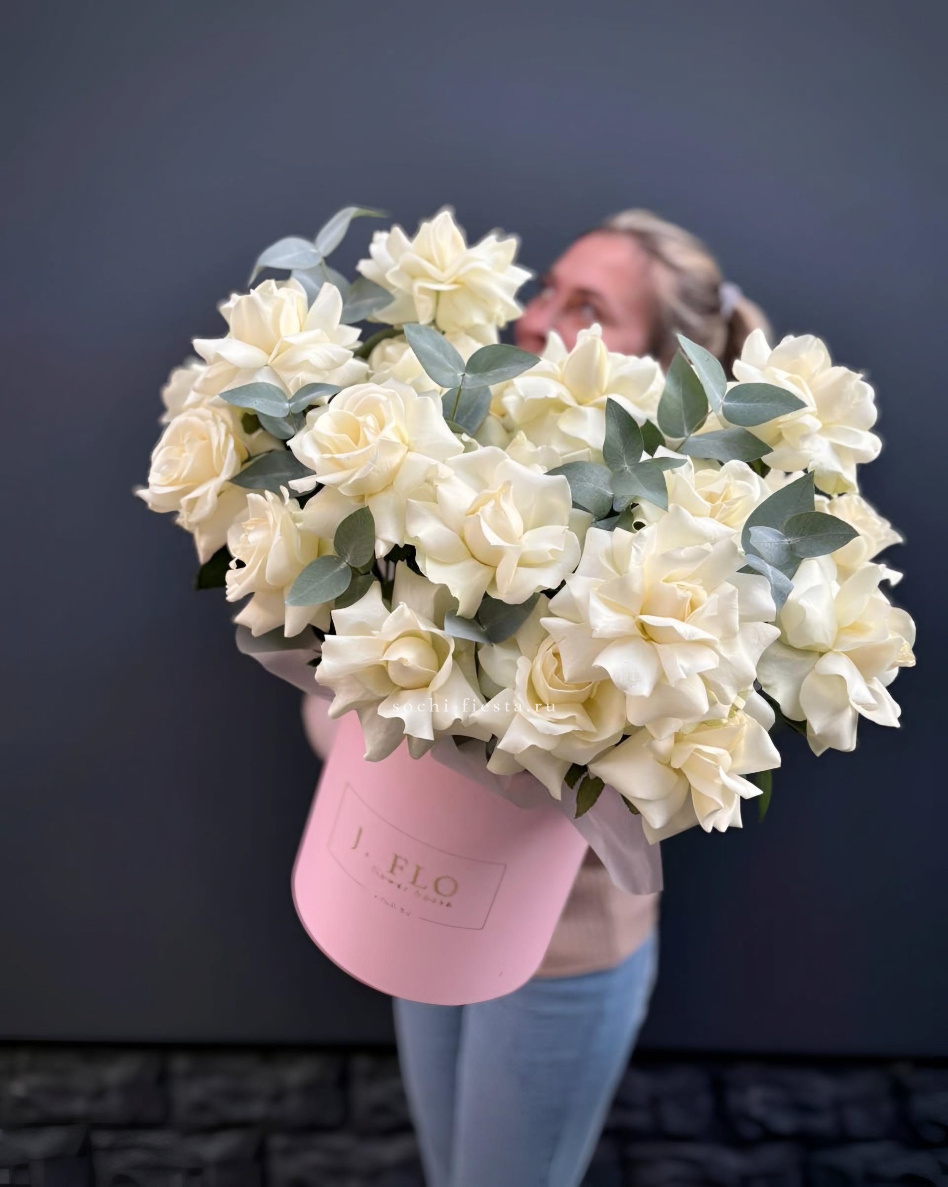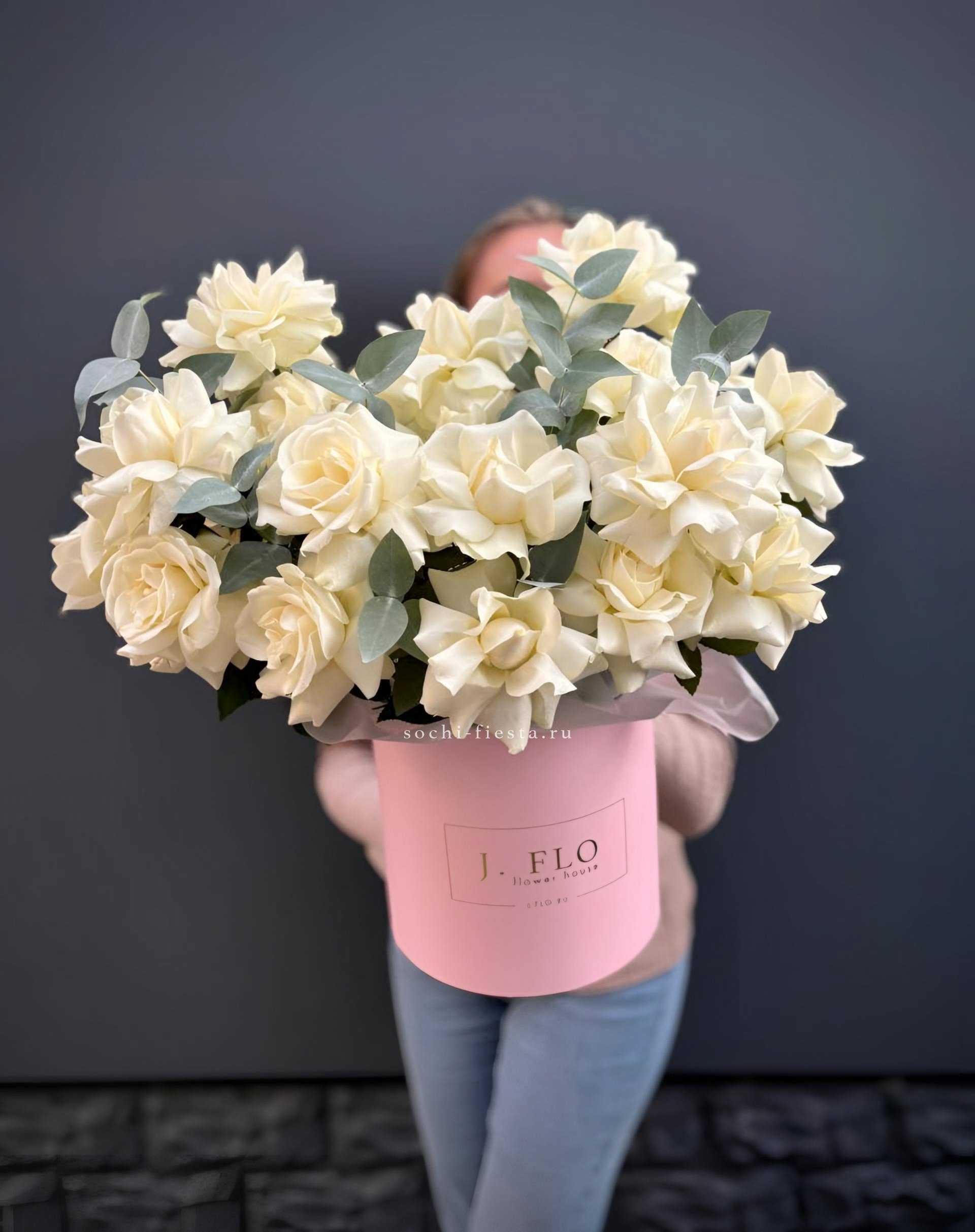 белые розы, хризантемы одноголовые, лилии, эвкалипт, бокс.
