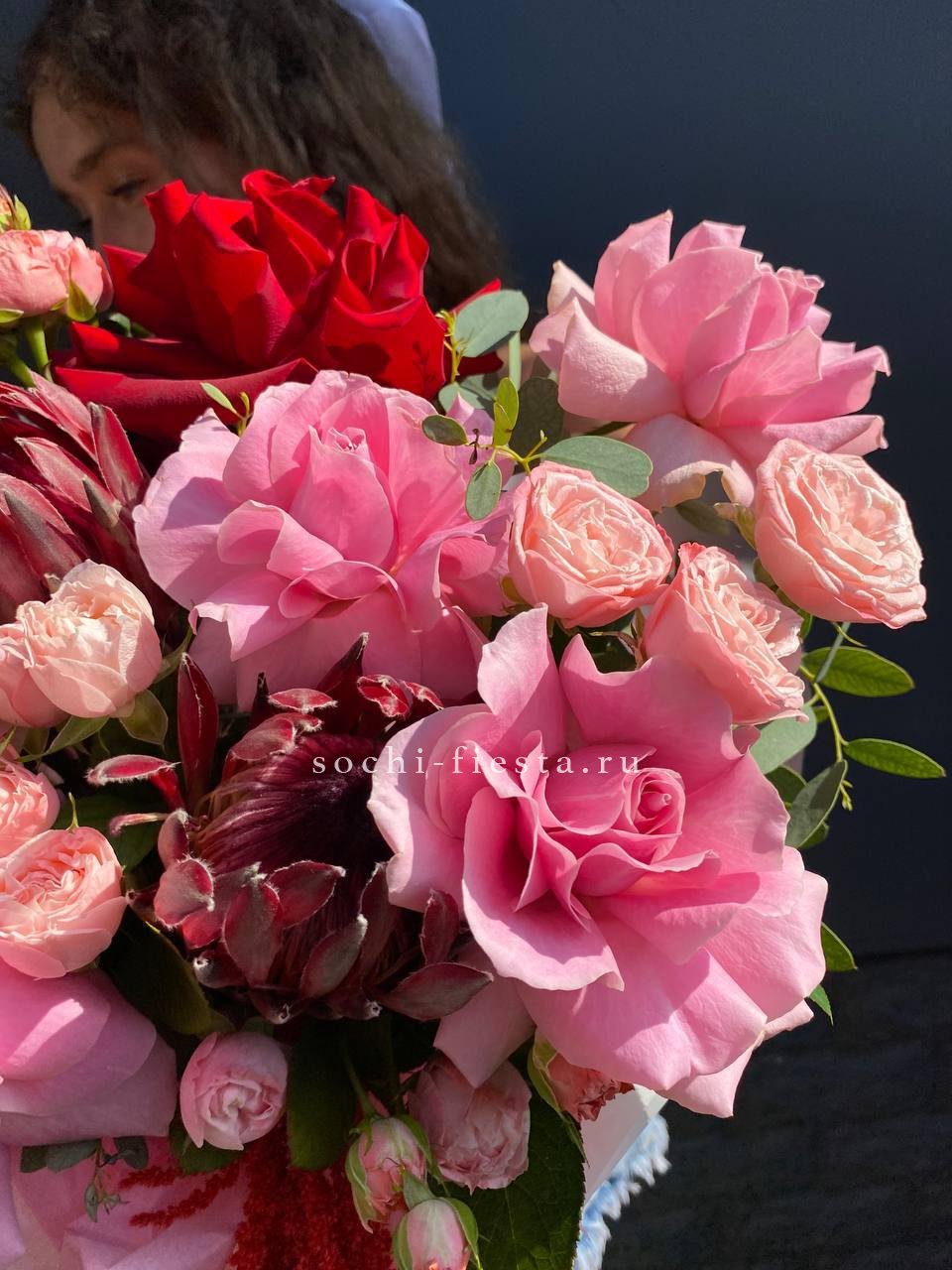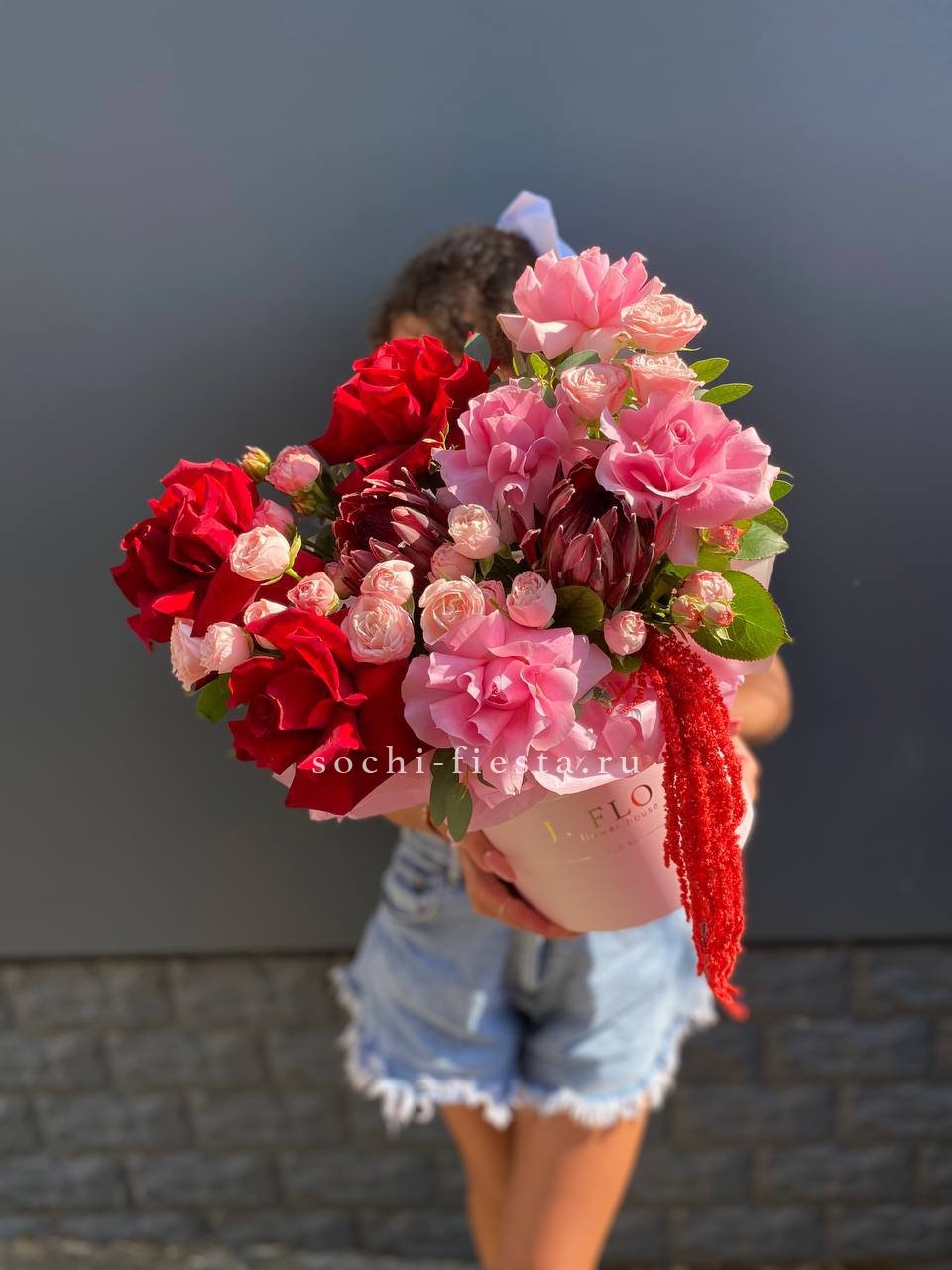 Букет выполнен в насыщенной красно-розовой гамме, создавая контрастное и выразительное сочетание, которое может символизировать сильные чувства или страсть. Это современный авторский букет, который выглядит роскошно и эффектно, подходящий для особых случаев и подарков.