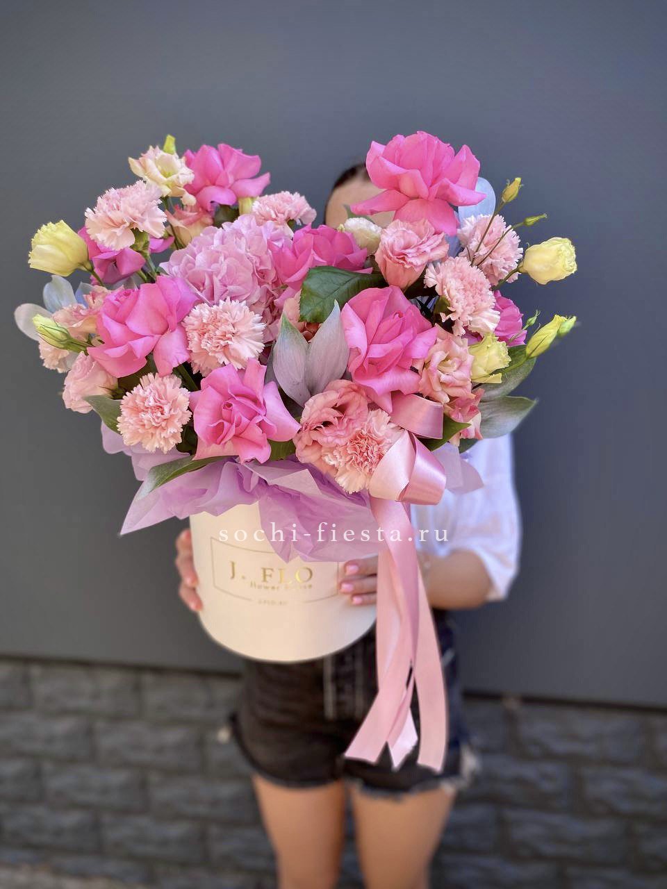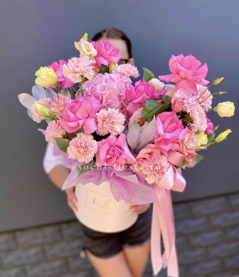гортензия, пионовидные розы, одноголовые розы, диантус, герберы, георгины, цилиндр D 40 Состав может меняться в зависимости от сезона.