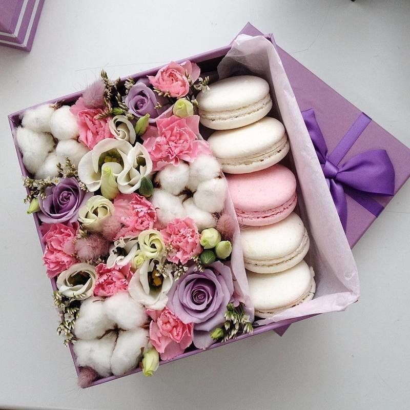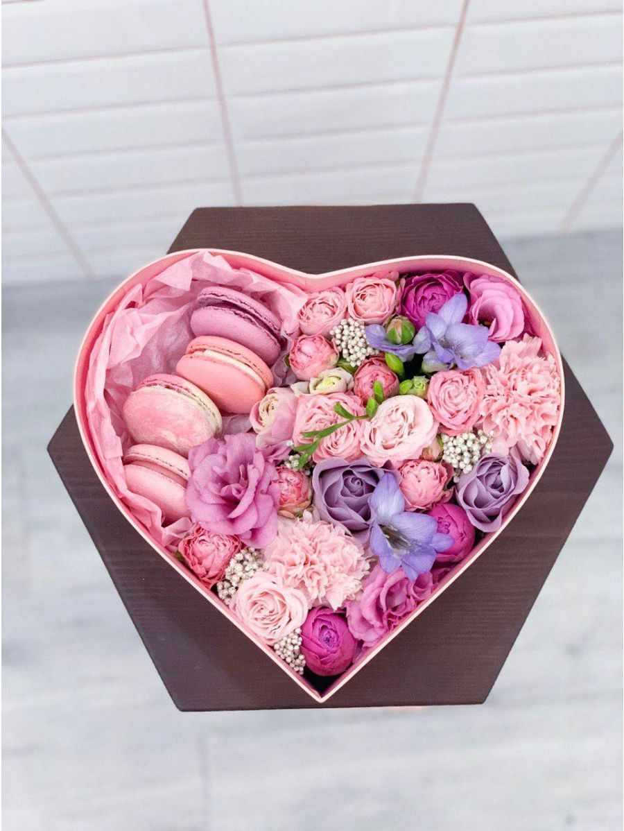 Розовые розы и диантусы наполняют круглую коробку мягким цветом и создают ощущение весенней свежести. Шесть макаронс добавляют сладкую ноту этой композиции. Вся палитра построена на переходах одного оттенка.