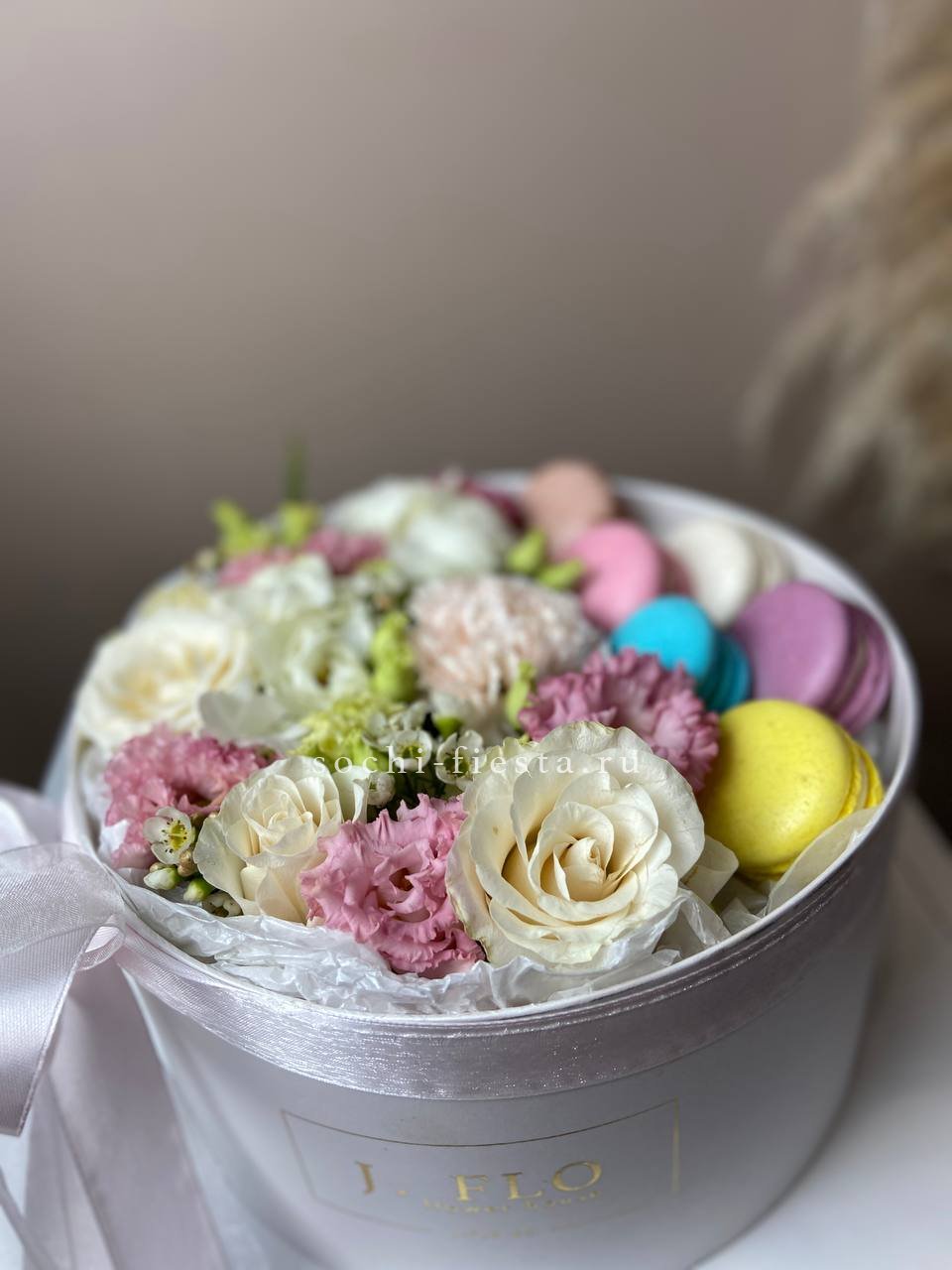комбинация цветочных элементов нежных оттенков, включая розы и диантусы, круглая коробка D20, 11 макаронс.