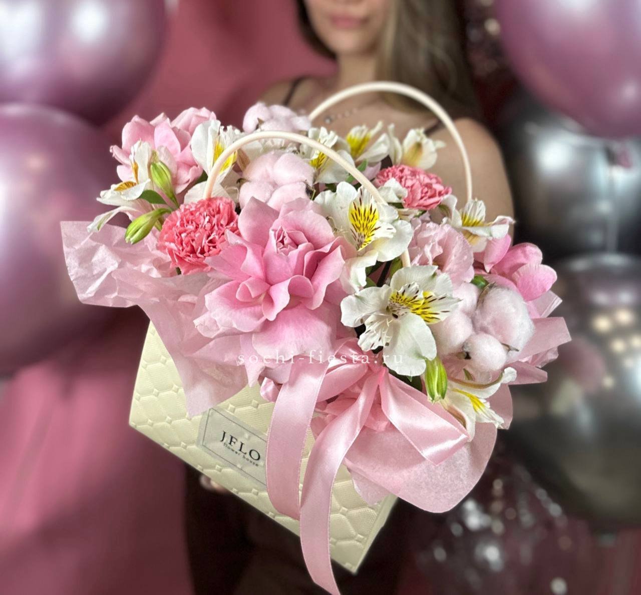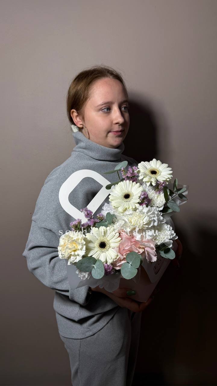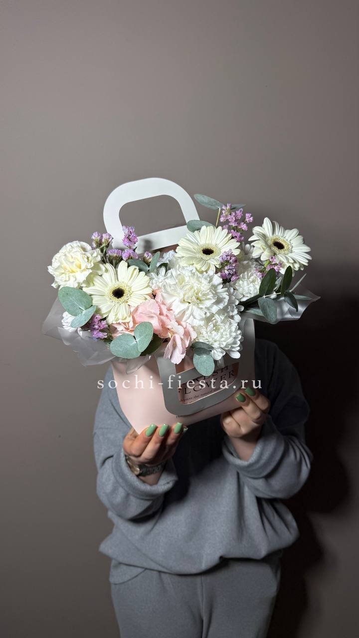 Хризантемы и маттиола собраны в компактную форму с лиловыми переливами. Статица добавляет воздушности, а сумочка делает композицию мобильной и готовой к вручению. Цветы закреплены в оазисе для длительной свежести.