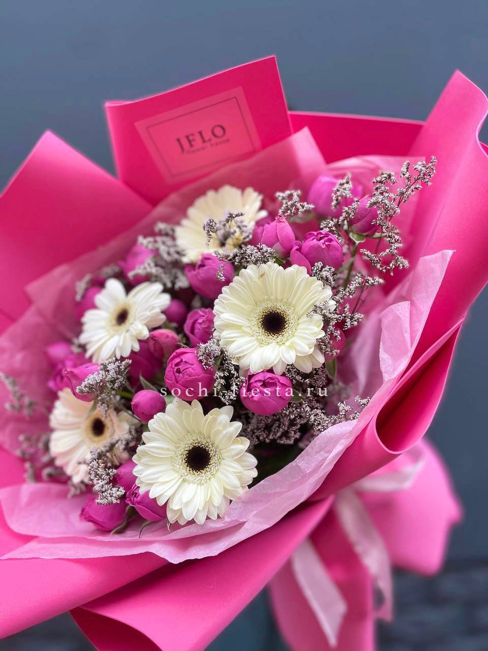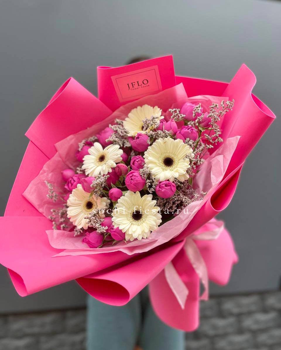 Этот букет создан, чтобы заряжать позитивом! Яркие акценты розовых гербер и теплые оттенки кремовых роз, в обрамлении свежей зелени, создают ощущение солнечного дня и беззаботного счастья. Это не просто цветы, а концентрат радости, который мгновенно поднимет настроение и добавит ярких красок в жизнь.