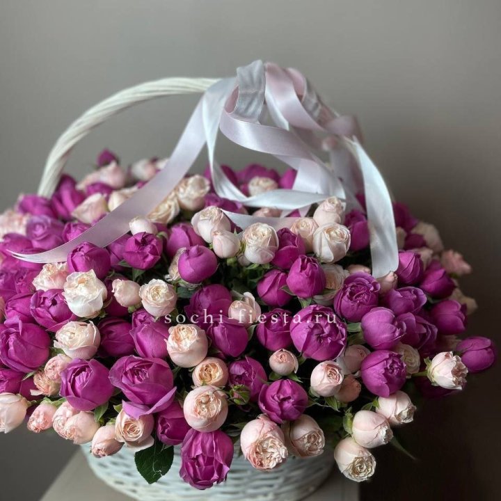 Состав корзин в Прокопьевске определяется текущими поставками и сезоном. Розы Freedom, Mondial, Cappuccino — для классических куполообразных аранжировок. Пионы в мае-июне из свежих поставок: Sarah Bernhardt, Red Charm, Bowl of Cream — главный сезонный продукт. Хризантема, альстромерия, гербера — для объёмных торжественных наполнений. Эустома, ранункули — для садовых корзин. Флорист строит состав под конкретный запрос.