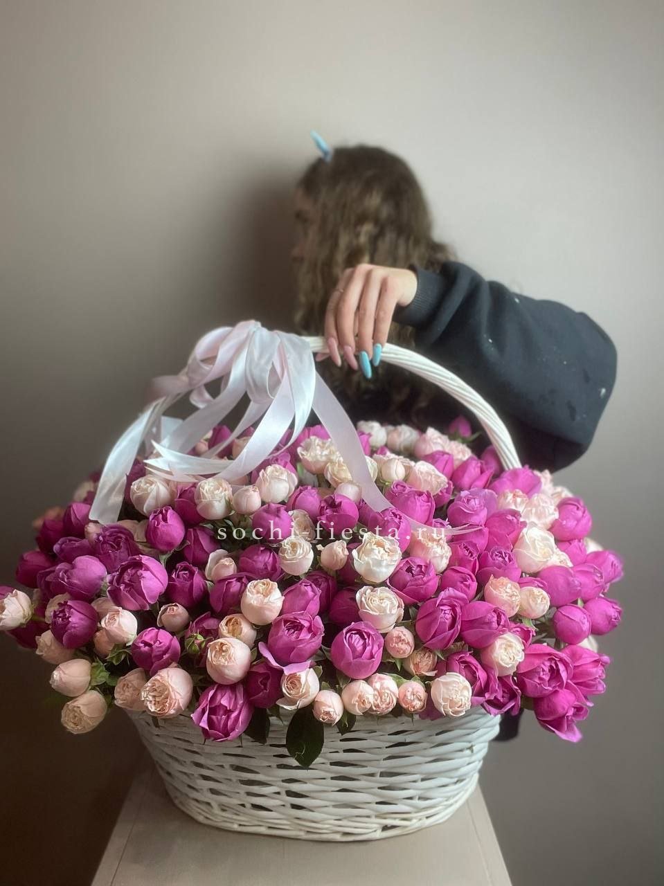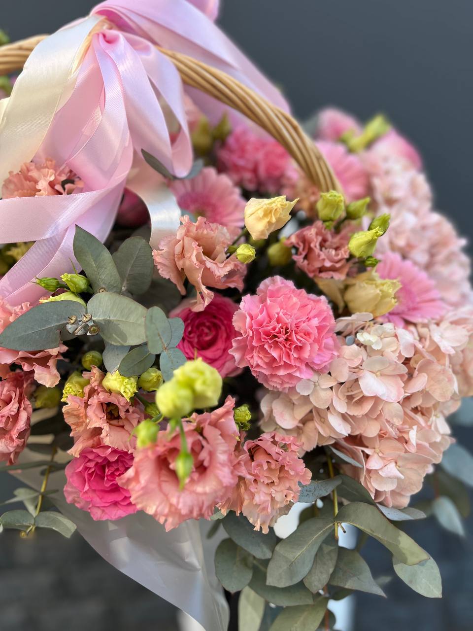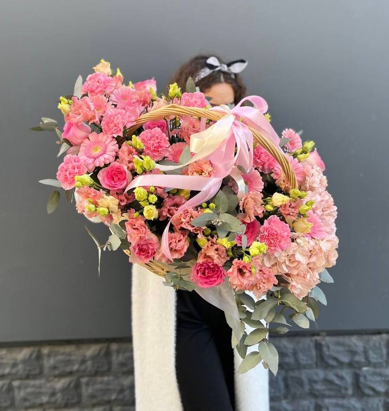 Восемь видов цветов складываются в harmonичную композицию со светлой корзиной в основе. Диантусы и эустома перекликаются с розами, а гортензия задает мягкий объем всей структуре.