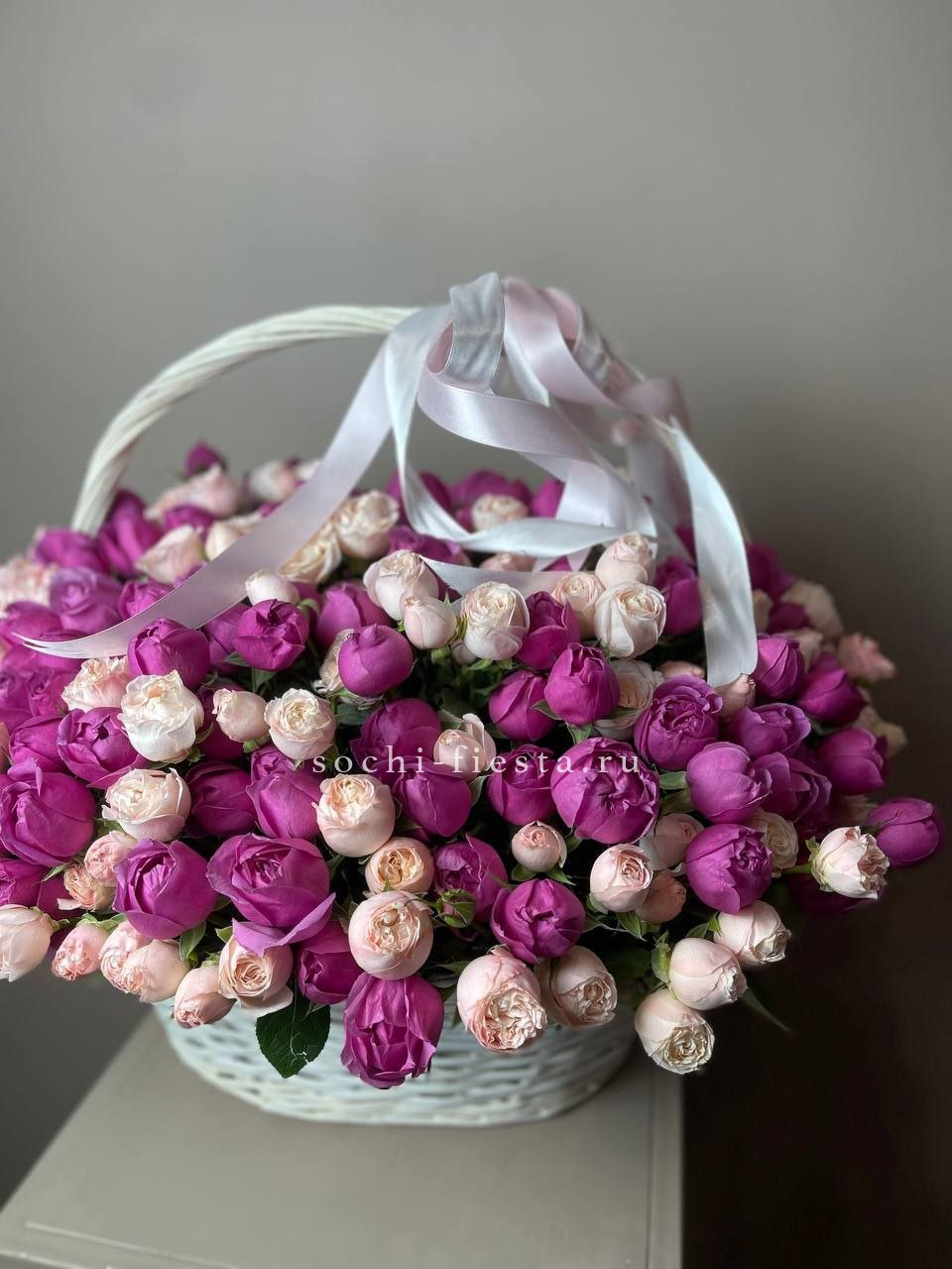 кустовые розы, одноголовые розы, диантусы,  гортензия, эустома, антиринум, озатамус, хризантема, герберы, лента, светлая корзина.Состав может меняться в зависимости от сезонности.