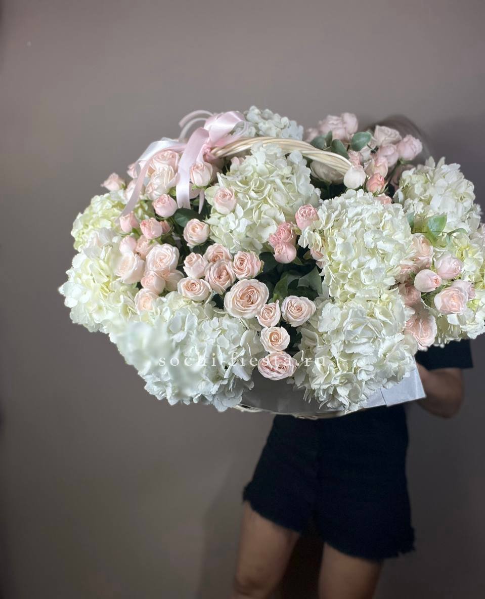 Пышная корзина с розами и гортензией раскрывается мягкими переходами розовых тонов. Эустома и диантус добавляют воздушности, а эвкалипт создает свежую основу для многослойной композиции. Авторская работа для важных событий и значимых встреч.