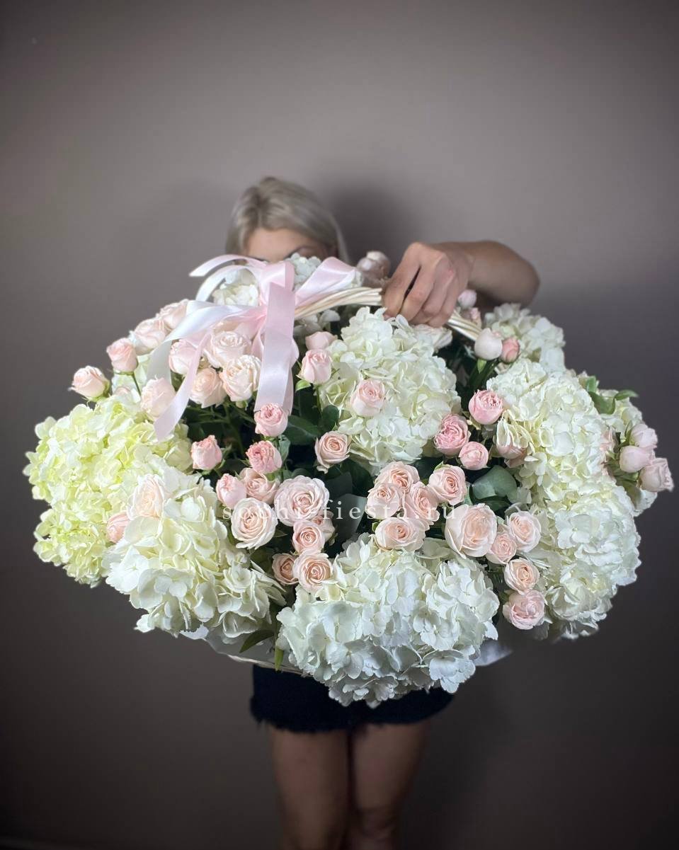 гортензия нежно-розовых оттенков, эустома, пионовидная кустовая роза, эвкалипт, диантус, антиринум, розы, лента, корзина.