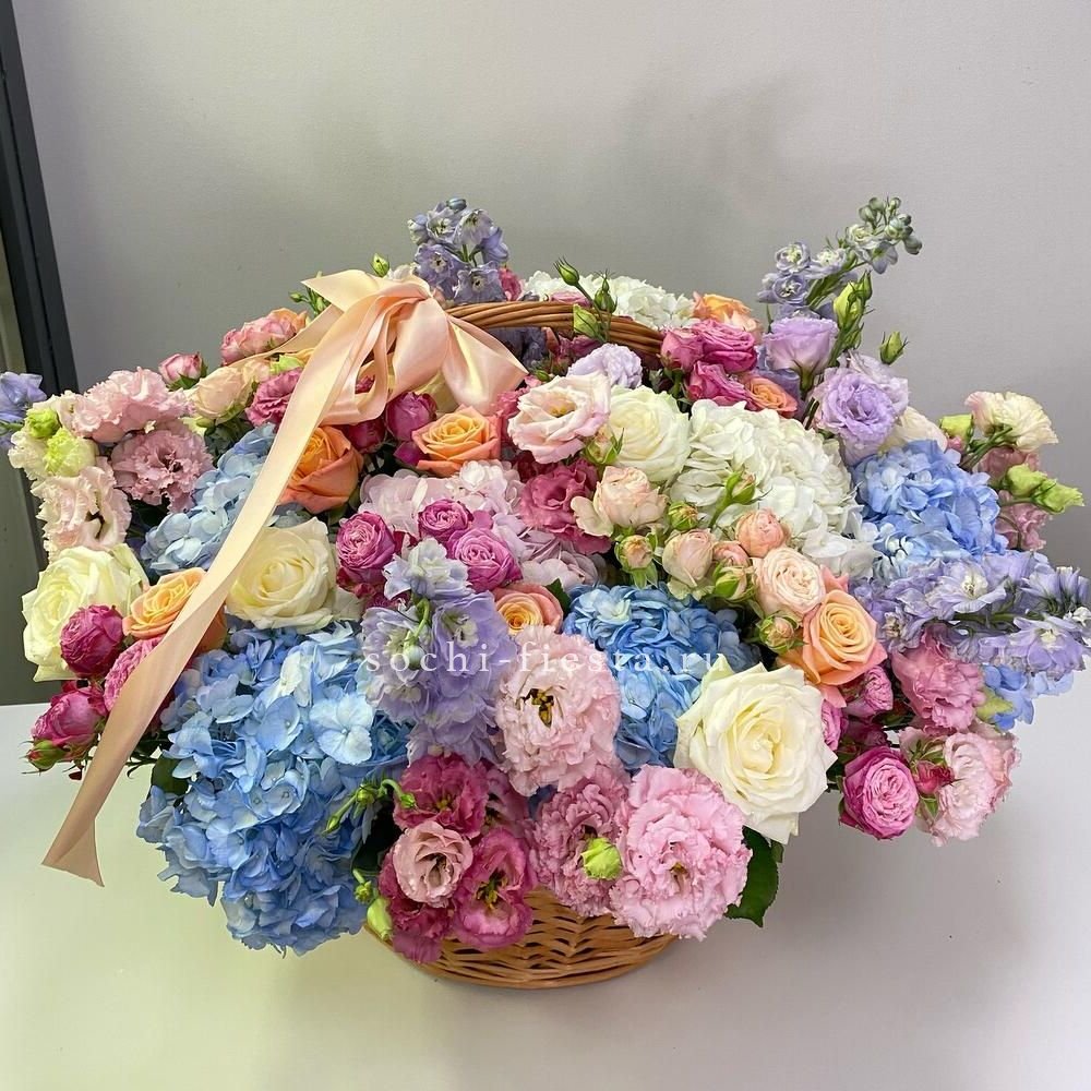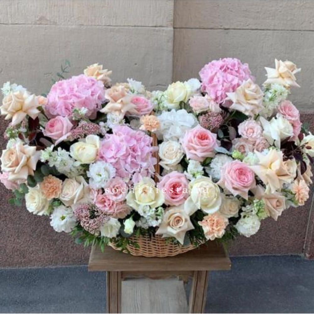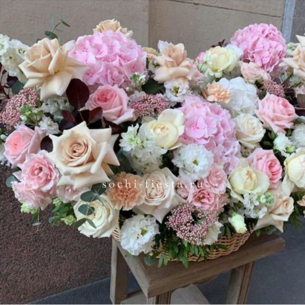Пышная композиция в корзине собрана из роз двух видов и воздушной эустомы в бело-розовой гамме. Фисташка добавляет свежести, а округлая форма создает ощущение наполненности и объема.