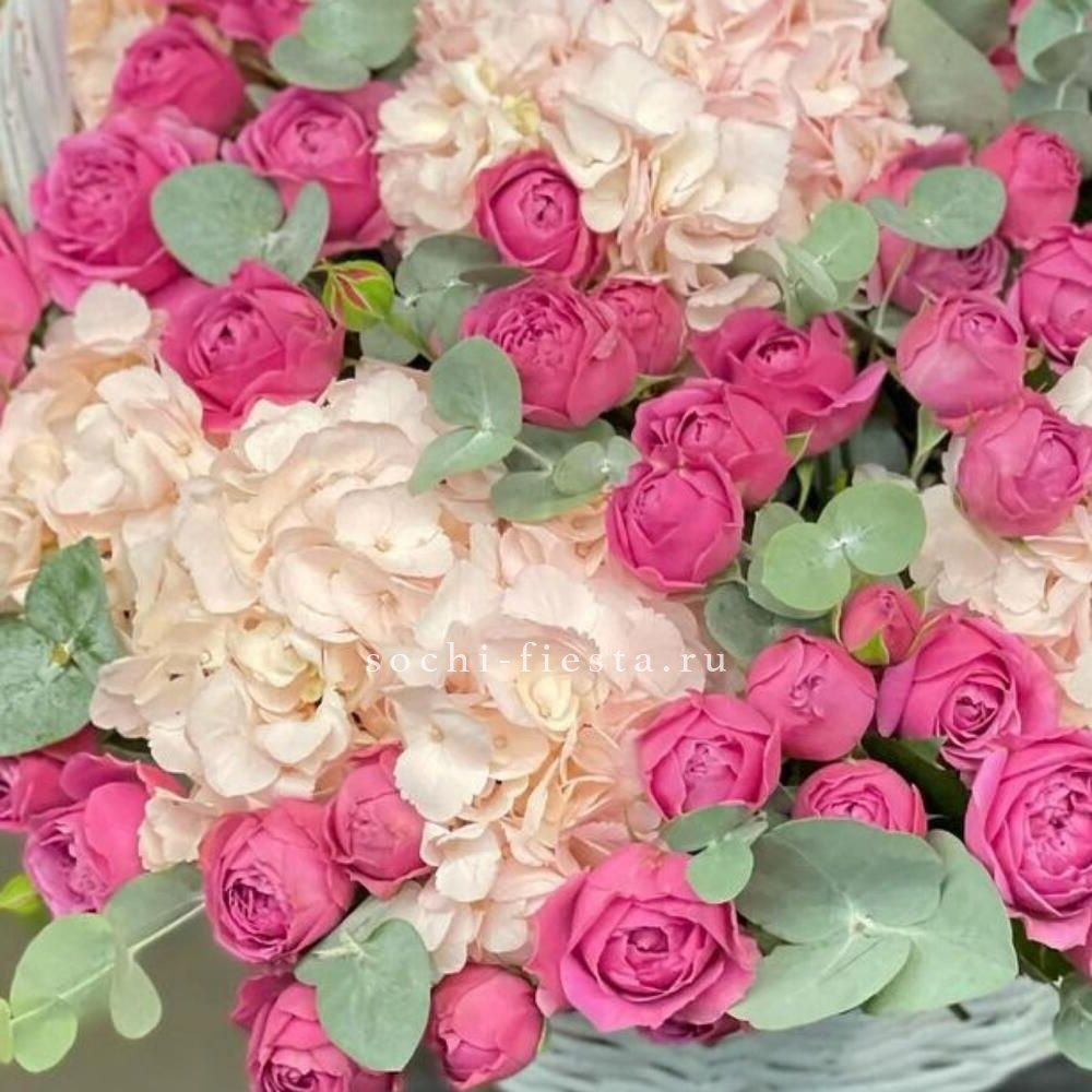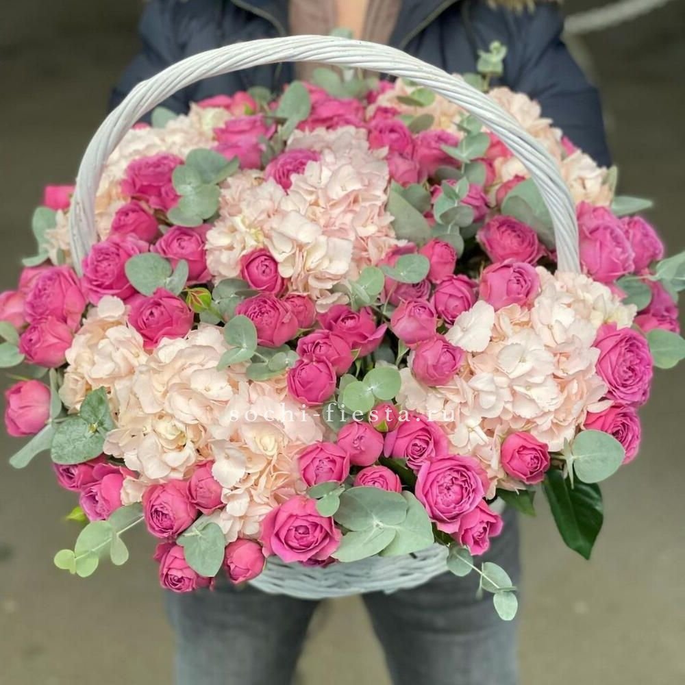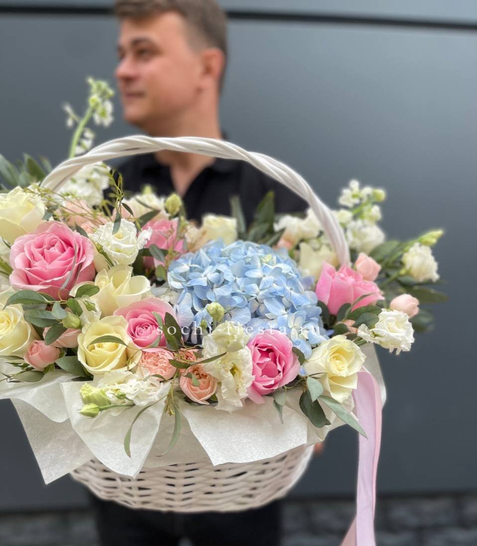 Пышная корзина объединяет пионовидные розы с воздушной гортензией и многослойной эустомой. Матиолла и лимониум добавляют глубину композиции, а диантус создает мягкие переходы между крупными бутонами.