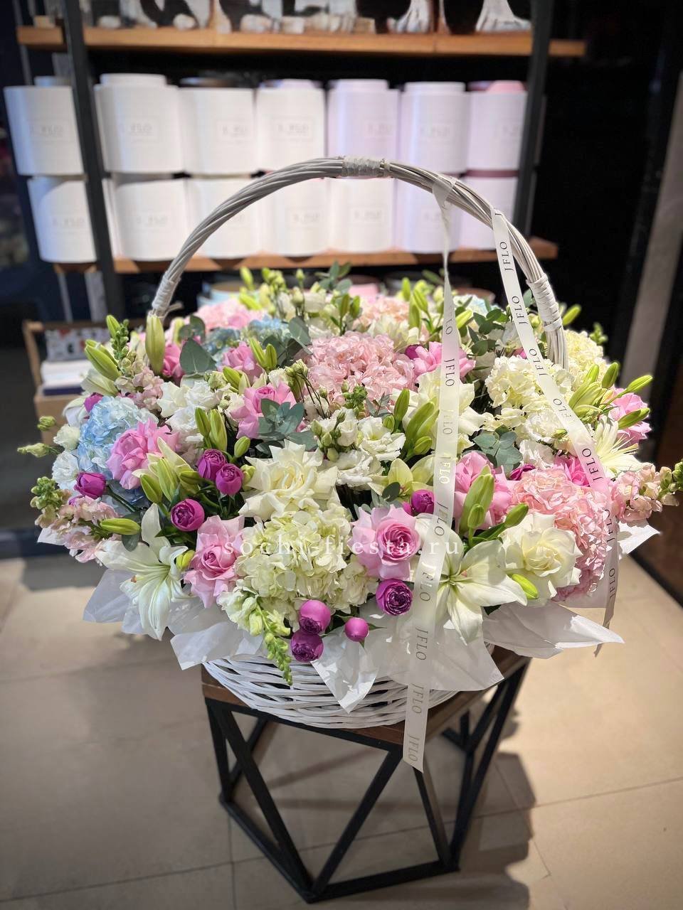 лилии, гортензия, антиринум, мисти баблс, розы, эустома, корзина гигант.